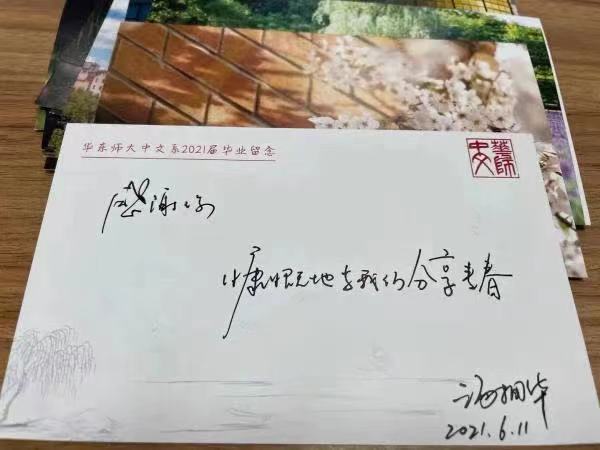 在2021届学生即将离开丽娃河畔和樱桃河边的象牙塔奔赴各自的前程之际,陪伴他们度过四年、七年甚至更长久时光的老师们送上了别出心裁的祝福。中文系教师们手写明信片盲盒送给毕业生,在6月16日下午中文系的毕业典礼上,该系283位本硕博毕业生收到一份特殊的毕业礼物——毕业生登台拨穗时,会收到一个盲盒信封,信封中是一张由中文系教师包括胡晓明、谭帆等知名学者手写的明信片,其中汤拥华教授写道:“感谢你们,慷慨地与我们分享青春。”