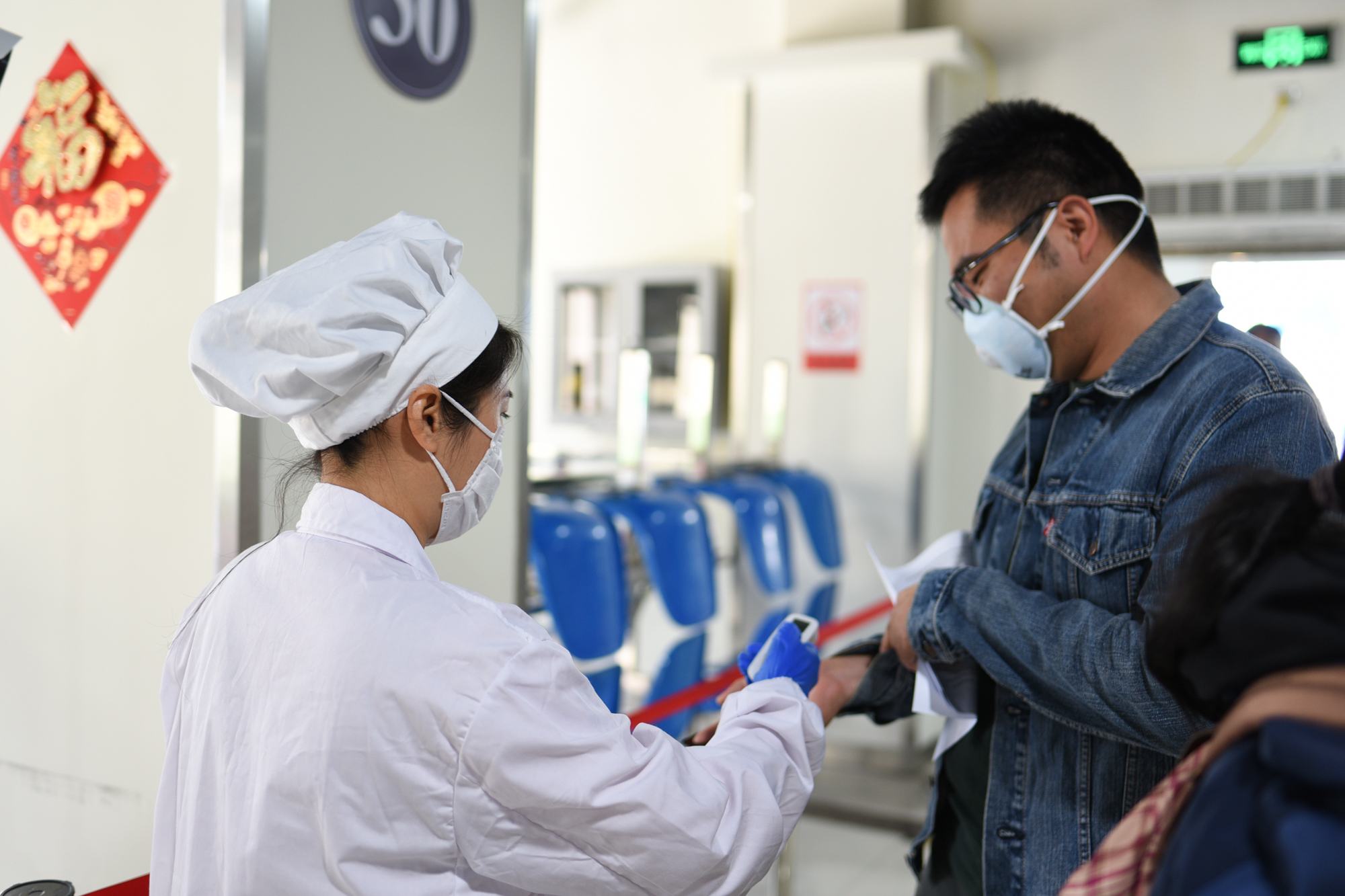 “体温正常吗?是哪个学院的?”进入宿舍楼前,学生需要再次进行体温检测、出示校园卡,宿舍工作人员逐一询问确认信息,和提前打印好的花名册核对无误后方可放行,同时发放相关须知等,提醒学生注意个人卫生和宿舍通风。