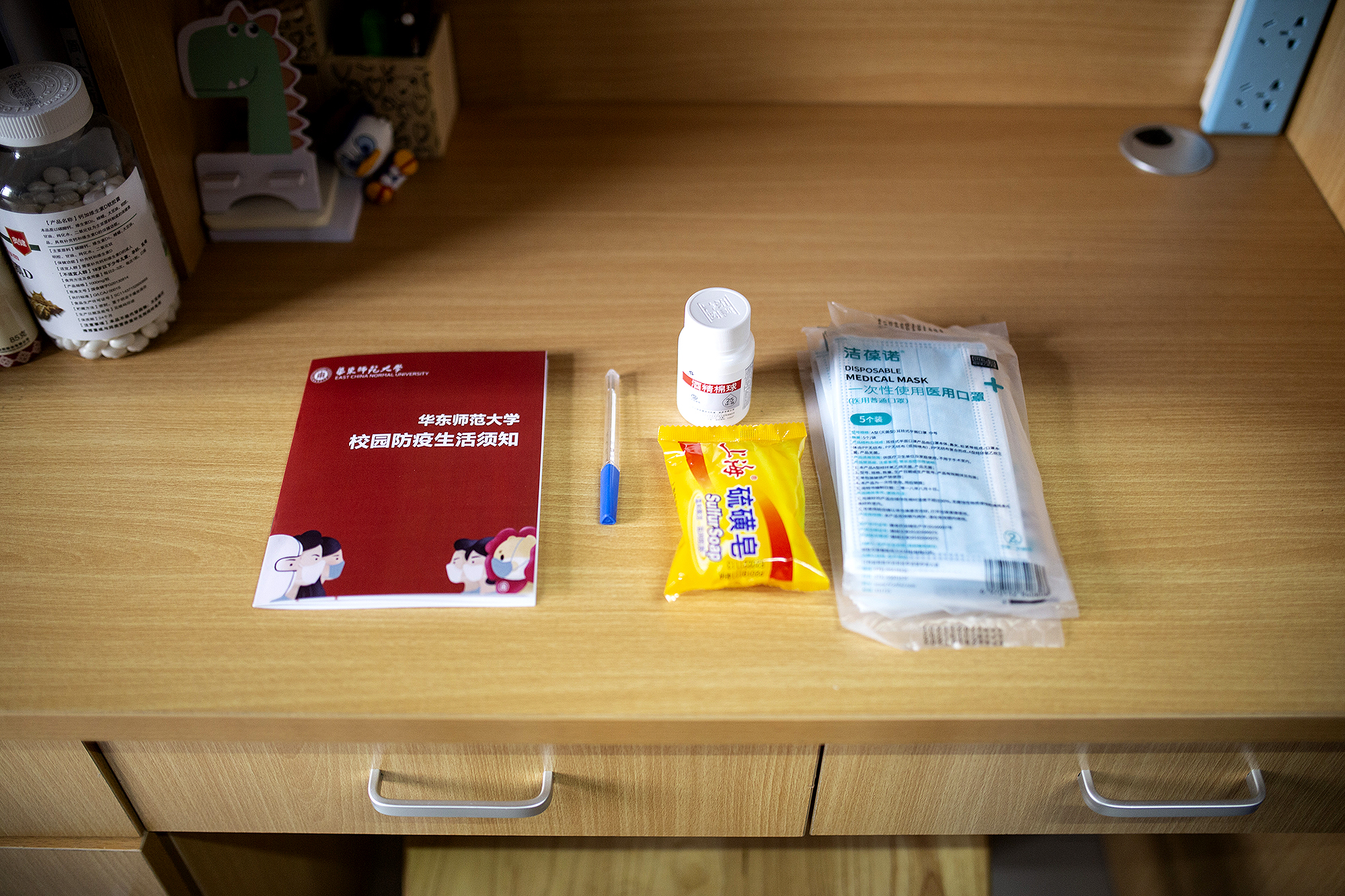 顺利入住后,每位返校学生会发现,书桌上已配好学校为大家准备的贴心防疫“五件套”:约两周用量的口罩、一根水银温度计、一瓶消毒酒精棉、一块药皂,还有一本《校园防疫生活须知》。宿舍楼内设单向进楼和出楼通道,公共区域、公共设施以及扶手、门窗等高频使用部位进行全面的清洁消毒,保持门厅、盥洗室、淋浴间、走廊等室内空气流通。宿舍区不接待访客。