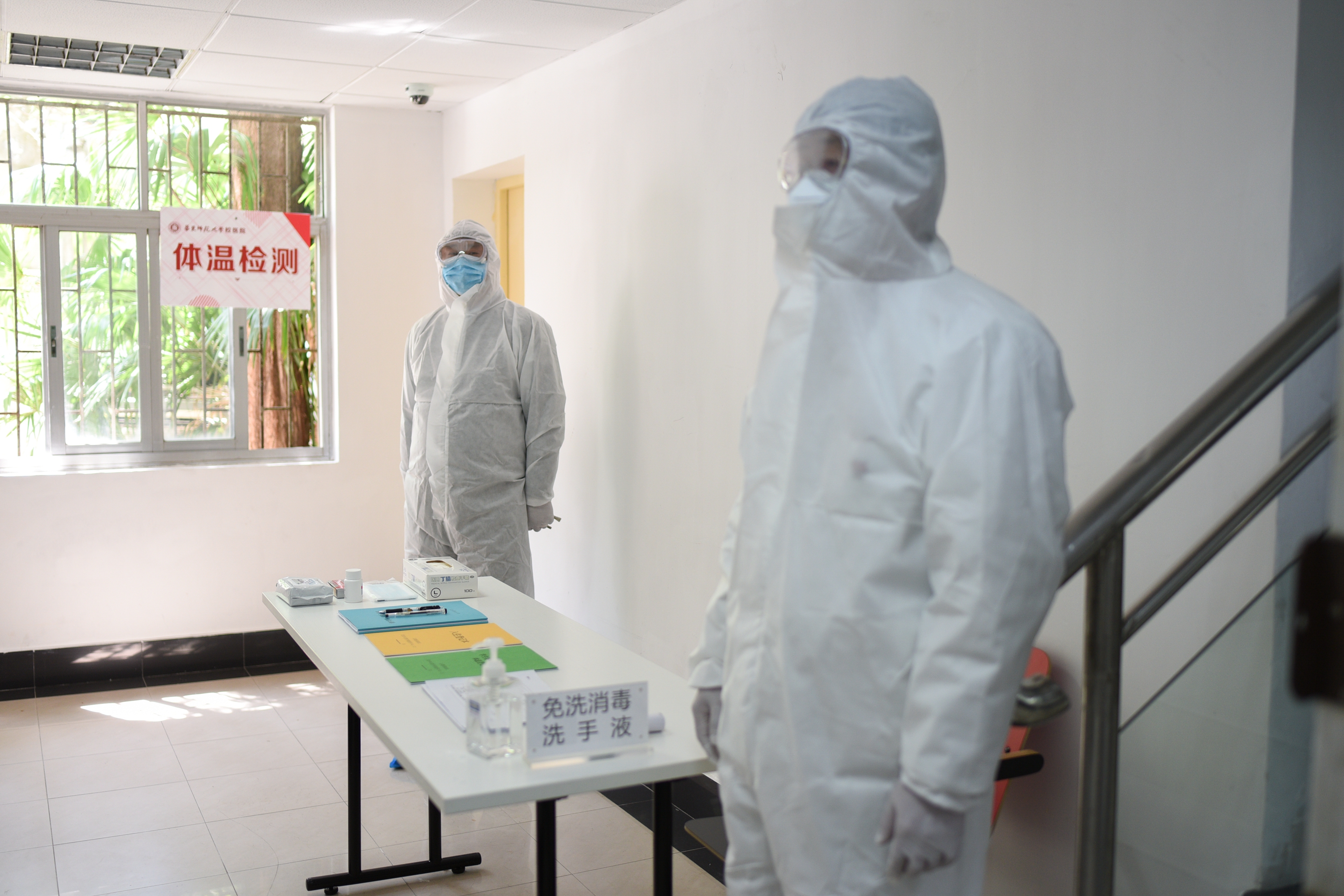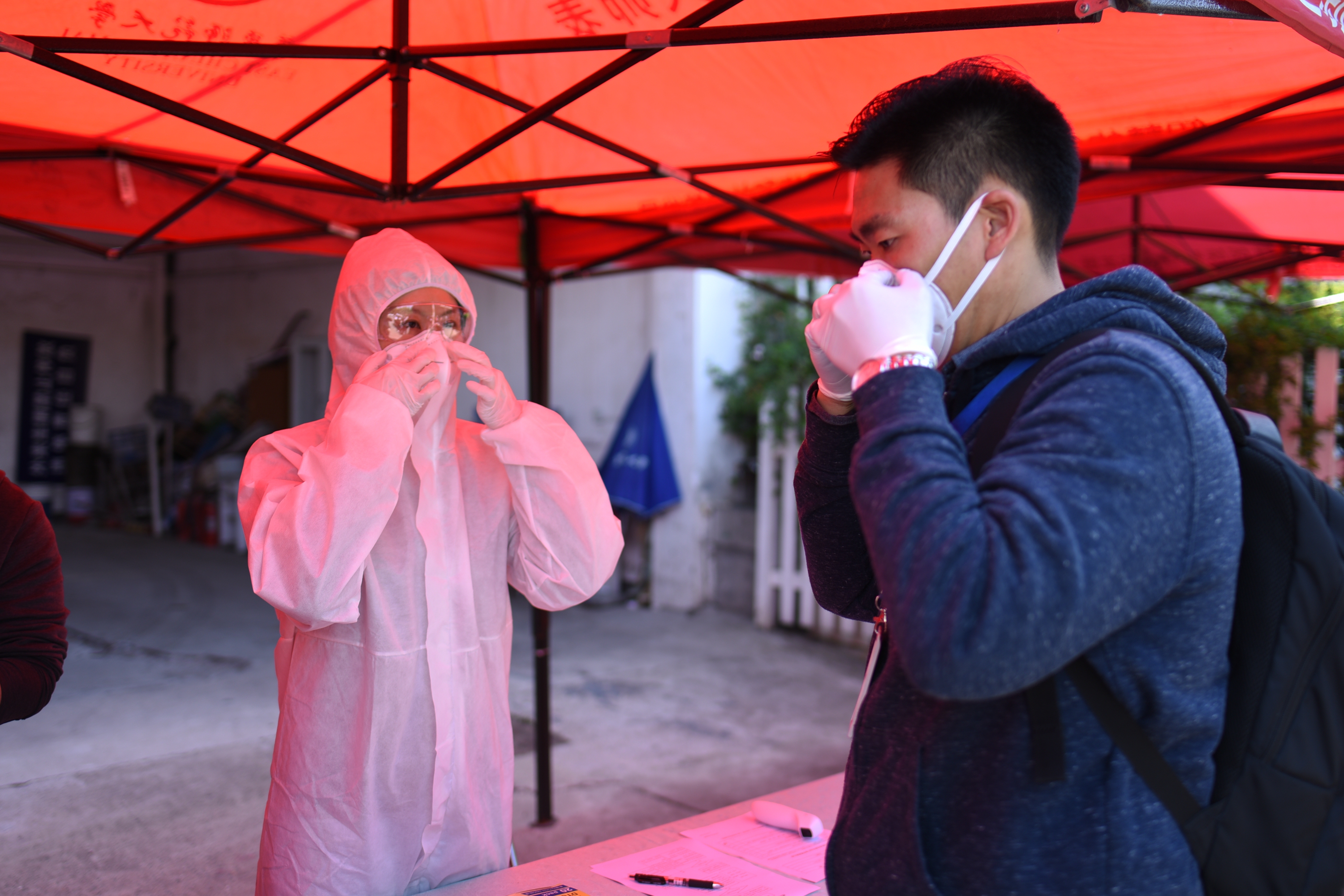 模拟出现发热学生后处理流程,行李做标记留存宿舍,学生前往校医院复测