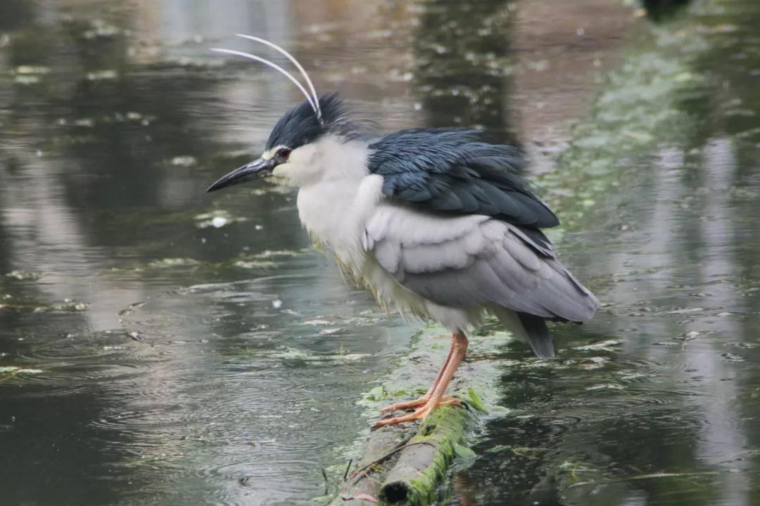 继续沿着河边走,丽娃河中间的喷泉设施上偶尔会有一只蓝黑色一动不动的大鸟,这是夜鹭,是校园常见鸟类中体型最大的鸟。傍晚时分从丽虹桥上空略过的它们,会发出“嘎嘎嘎”的沙哑叫声。