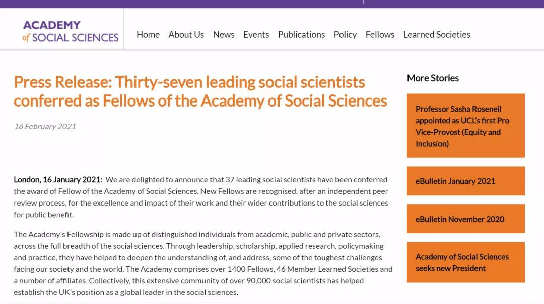 英国社会科学院公布37位新晋院士名单