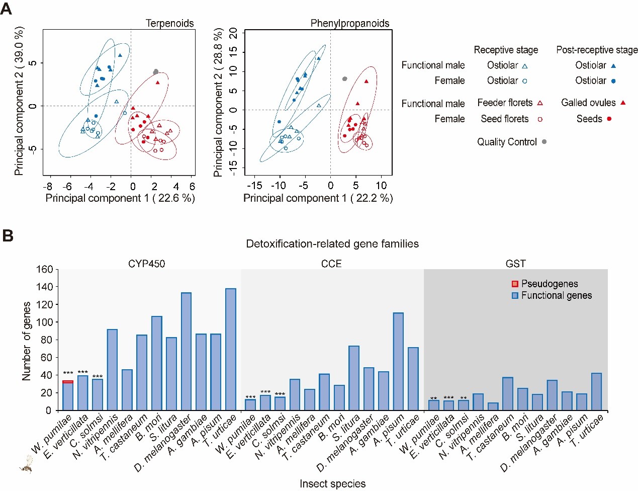 图3. 薜荔化学防御物质(萜类与苯丙素类)次生代谢物组成的聚类结果(A);薜荔小蜂解毒相关基因家族的基因数量(B)