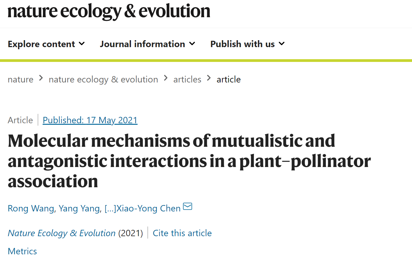 5月17日,《自然生态与进化》(Nature Ecology & Evolution)以长文(Article)形式在线发表了中外20个大学、研究机构35位学者联合发表的题为“Molecular mechanisms of mutualistic and antagonistic interactions in a plant–pollinator association”的研究成果。该研究以薜荔和薜荔榕小蜂为例,揭示了强制性共生互惠体系中植物与传粉昆虫相互适应的分子机制。