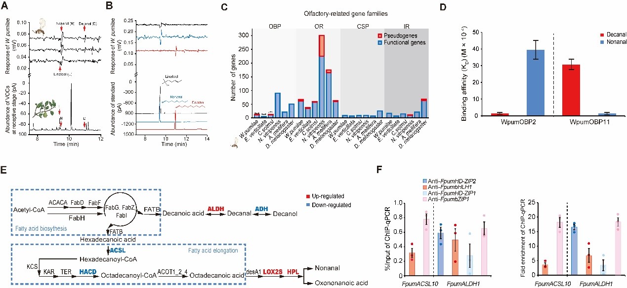 图2. 薜荔花序释放的气味谱(GC-MS结果)(A);采用GC-EAD技术鉴定吸引薜荔榕小蜂的特异性物质(B);薜荔榕小蜂嗅觉相关基因家族中的基因数量(C);关键气味结合蛋白结合能力(D);薜荔癸醛合成通路上的差异表达基因(E);免疫共沉淀验证转录因子调控能力(F)