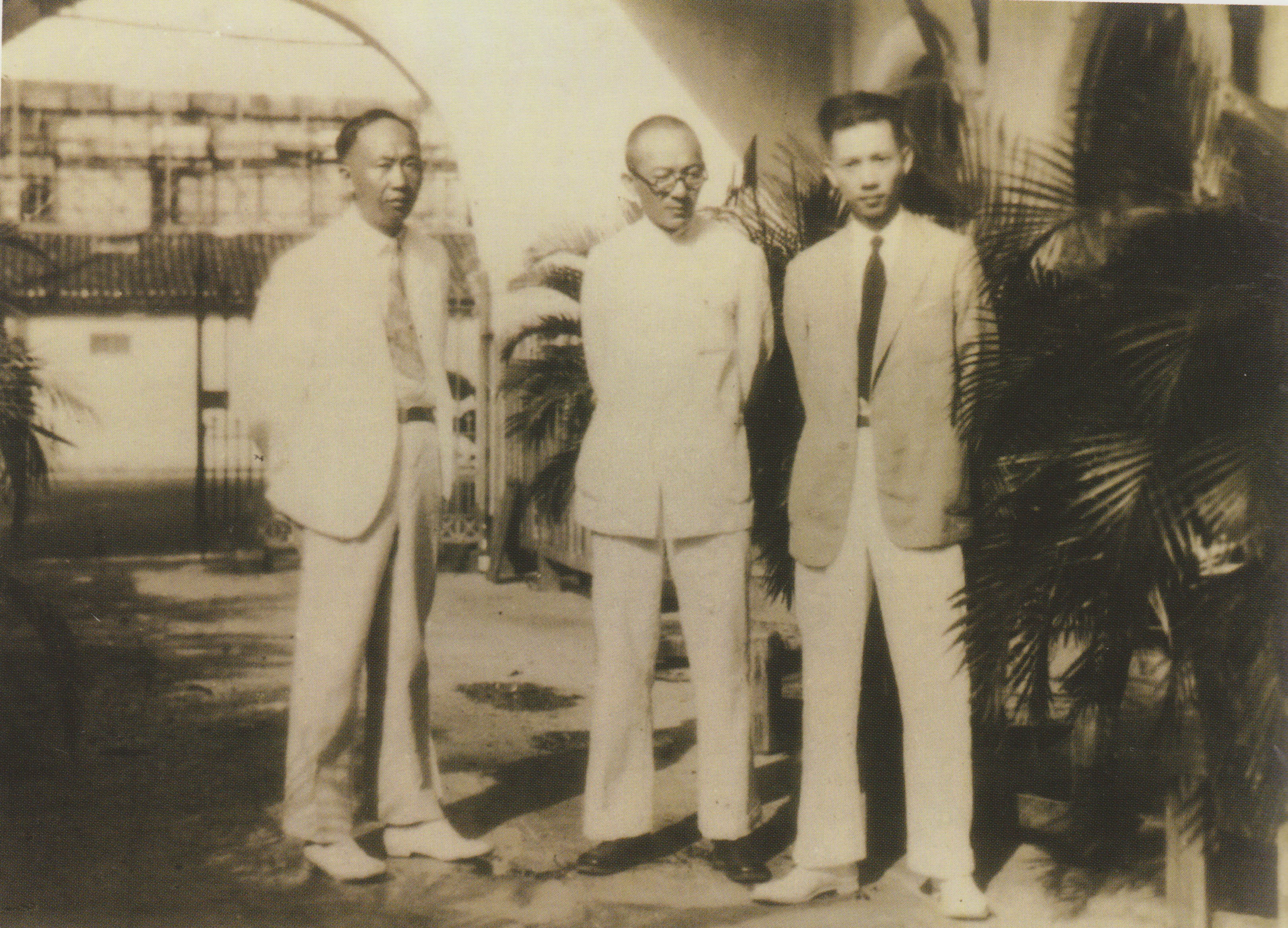 1929年,马君武(中)与欧元怀(右)、王毓祥在南洋为大夏大学募捐
