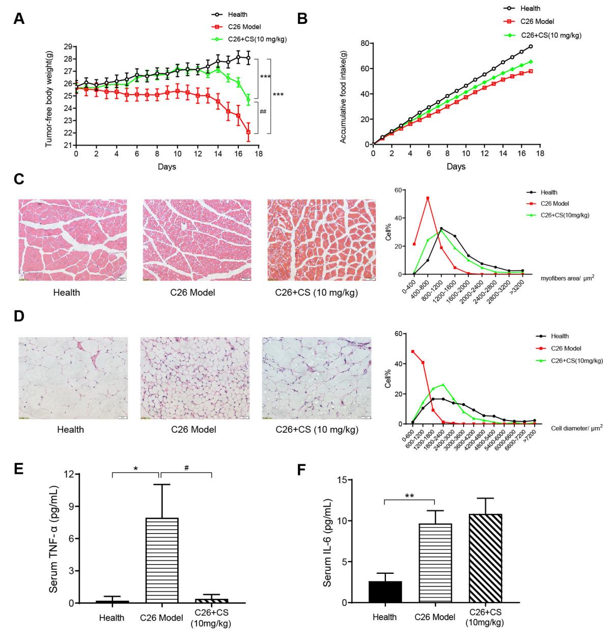 图2.CS对C26荷瘤小鼠恶病质症状的影响。A.小鼠去瘤体重变化。B.小鼠摄食量变化。C.小鼠腓肠肌切片染色。D.小鼠附睾脂肪切片染色。E.血清TNF-α浓度。F.血清IL-6浓度