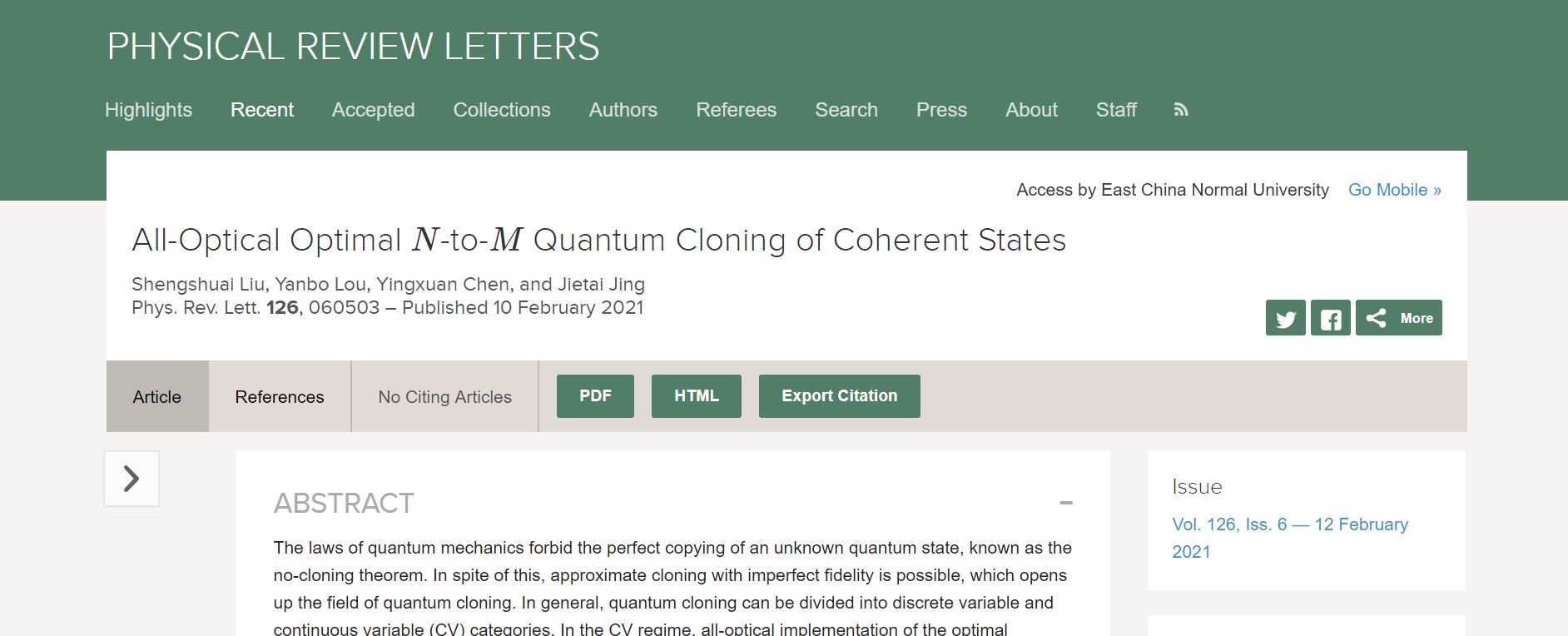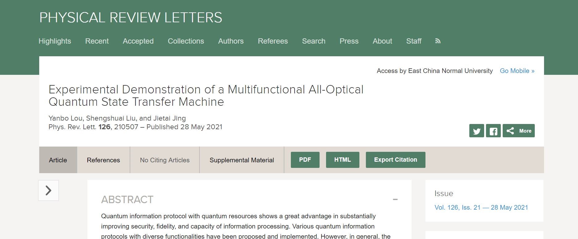 近期,万象城awcsport官网精密光谱科学与技术国家重点实验室荆杰泰教授团队在量子信息领域连续取得重要进展,两项相关研究成果相继发表于国际物理学重要学术期刊《物理评论快报》(Physical Review Letters 126, 060503 (2021) 以及Physical Review Letters 126, 210507 (2021))。量子信息协议利用量子资源突破经典信息处理方式,从而实现高容量、高保真度以及高安全性的新型信息处理。荆杰泰教授团队长期致力于发展新型量子光源及其在量子信息科学中的应用研究。该团队近期连续取得的两项科研成果聚焦于提升量子信息协议的信息处理保真度,分别在实验上实现了全光学最优化N→M量子克隆和多功能全光量子态传输机,研究了这两种量子信息协议中信息处理保真度提升的机制。
