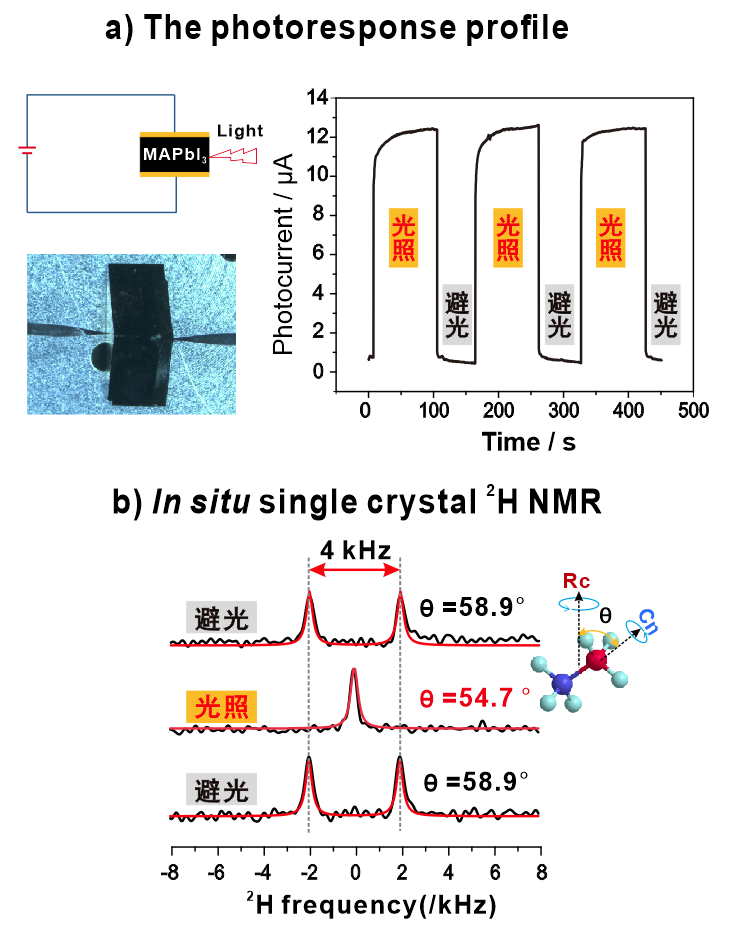 图2. a) 基于新型钙钛矿光电材料(MAPbI3)的光探测器示意图和该光探测器的光响应曲线图;b) 在避光和光照条件下,MAPbI3材料的原位单晶核磁共振谱图。