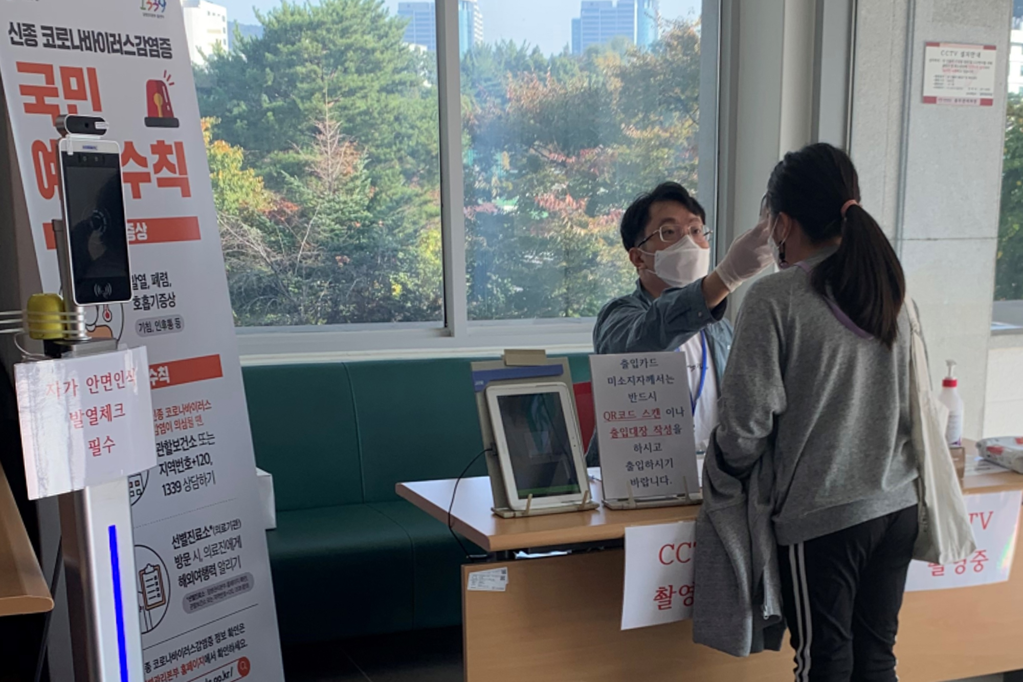 王思宇老师在为参加汉语水平考试的韩国学生检测体温
