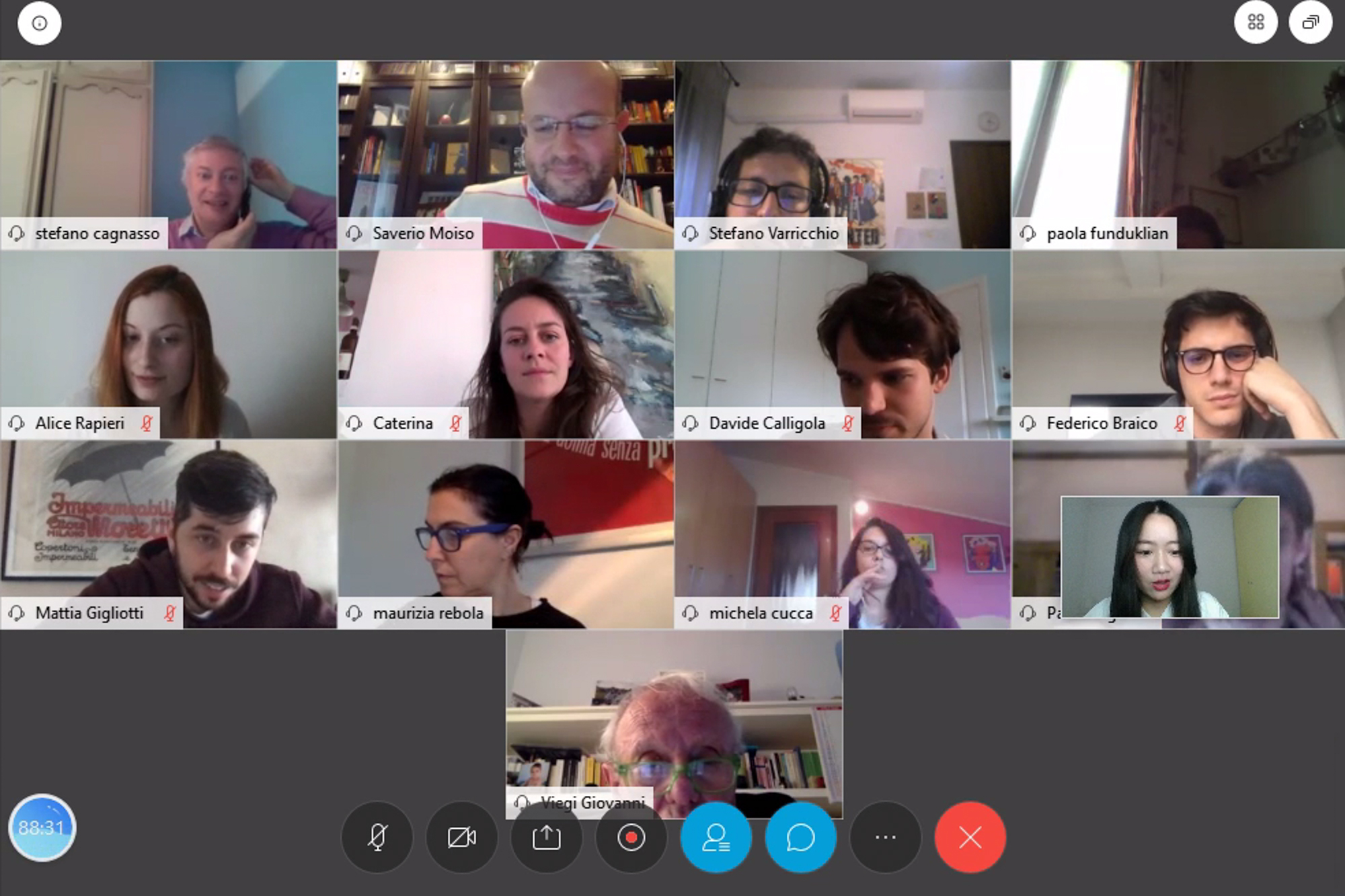 意大利都灵大学孔子学院的濮若依老师(第三行右一)在给意大利学生上网课