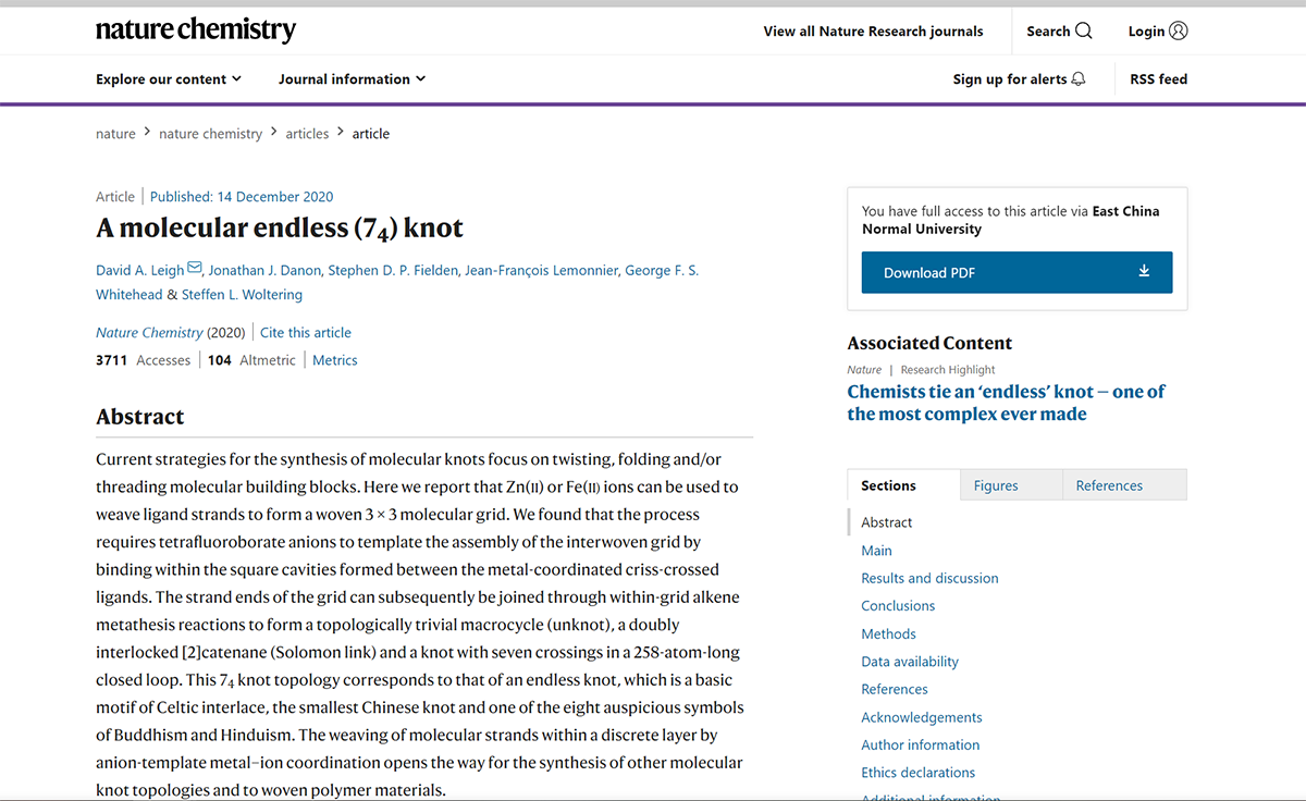 近日,英国皇家科学院和欧洲科学院院士、华东师大化学与分子工程学院特聘教授李大为(David Leigh)在分子拓扑学领域实现新突破。研究团队成功在纳米尺度上编织分子74结,其拓扑结构对应最小的中国结。研究成果以题为“A molecular endless (74) knot”发表在国际著名学术期刊《自然•化学》(Nature Chemistry 2020, DOI: 10.1038/s41557-020-00594-x),万象城awcsport官网为第一单位,李大为教授为通讯作者。