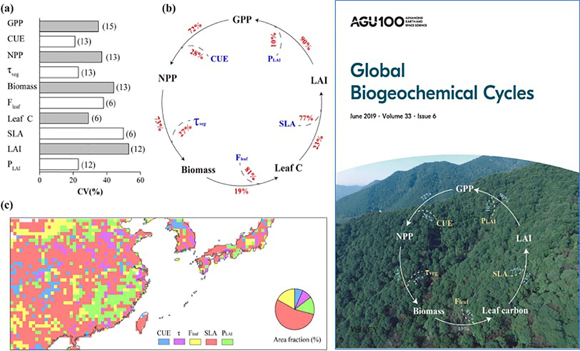 在全球碳循环模型中,植物功能性状是模拟生态系统生产力动态的关键参数,也是划分全球陆地表面植物功能类型的重要参考指标。该研究团队结合卫星遥感反演产品、涡度通量数据和原位观测数据,评估了十五个国际主流碳循环模型对东亚季风区生态系统生产力模拟的不确定性来源。该研究发现比叶面积和叶面积指数等植物叶片功能性状的表征差异是当前全球碳循环模型之间生态系统生产力模拟差异的重要来源(图3)。该研究成果以“Vegetation functional properties determine uncertainty of simulated ecosystem productivity: a traceability analysis in the East Asian monsoon region”为题发表于地学著名期刊《Global Biogeochemical Cycles》,并被选为当期的封面文章。