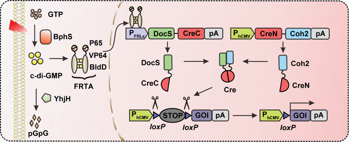 为了解决以上科学问题,该研究以低强度的远红光外部照射作为控制手段(730nm,LED光源),借助于远红光本身的组织器官通透性高优势,很好地解决了上述的组织穿透性差和毒性大的问题,实现了非侵入性的安全有效远程无痕控制。在课题组多年的研究经验和积累之上,研究团队将响应远红光和合成c-di-GMP的光敏蛋白BphS,响应c-di-GMP的BldD蛋白以及Cre重组酶进行合理拼接组装,开发了一套远红外光调控的分割型Cre-loxP重组酶系统。该系统主要是将Cre重组酶分成CreN59(第1–59个氨基酸)和CreC60(第60–343个氨基酸)两部分,其中CreN59与Coh2蛋白融合被组成型启动子表达,CreC60与DocS蛋白融合被远红光诱导表达。两部分分割的Cre重组酶在DocS与Coh2蛋白自发相互作用下重新形成有功能的完整Cre重组酶,进而识别报告基因中loxP位点切除阻止基因表达的STOP序列,从而启动目的基因表达(图1)。