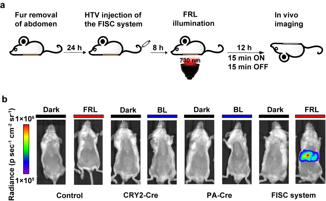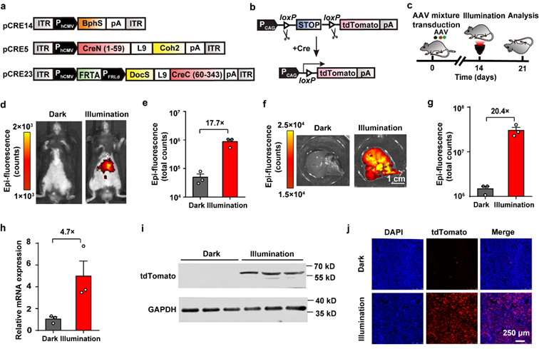 随后,研究团队将FISC系统构建在腺相关病毒AAV载体上,利用AAV病毒将FISC系统递送到tdTomato转基因报告小鼠(Gt(ROSA)26Sortm14(CAG-tdTomato)Hze)。该转基因报告小鼠经过远红光照射后,在体内诱导合成的Cre重组酶会切割基因组上的loxP序列,切除STOP序列,表达tdTomato红色荧光蛋白。通过观察小鼠活体成像和肝脏成像发现,与黑暗组小鼠相比,光照组后小鼠荧光蛋白表达量更高。这充分说明利用AAV载体成功实现了FISC系统在小鼠体内的高效DNA重组。