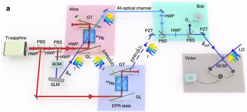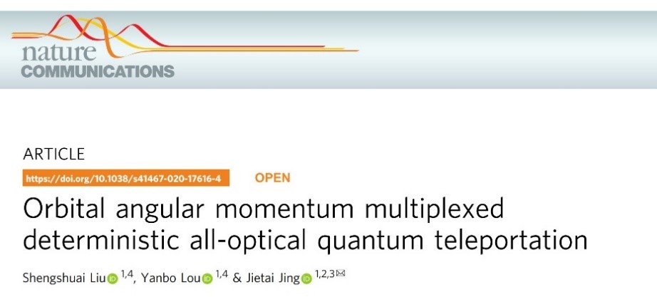万象城awcsport官网精密光谱科学与技术国家重点实验室荆杰泰教授团队利用前期发展的光学轨道角动量复用的连续变量纠缠源结合全光量子隐形传态协议,在国际上首次实验成功构建了多通道复用的全光量子隐形传态协议,为发展高容量连续变量量子信息协议奠定了重要的科学基础。该成果以“Orbital angular momentum multiplexed deterministic all-optical quantum teleportation”为题于2020年8月发表在Nature Communications上。万象城awcsport官网为论文的第一完成单位,精密光谱科学与技术国家重点实验室的博士研究生刘胜帅和娄彦博为论文的共同第一作者,荆杰泰教授为论文的通讯作者。