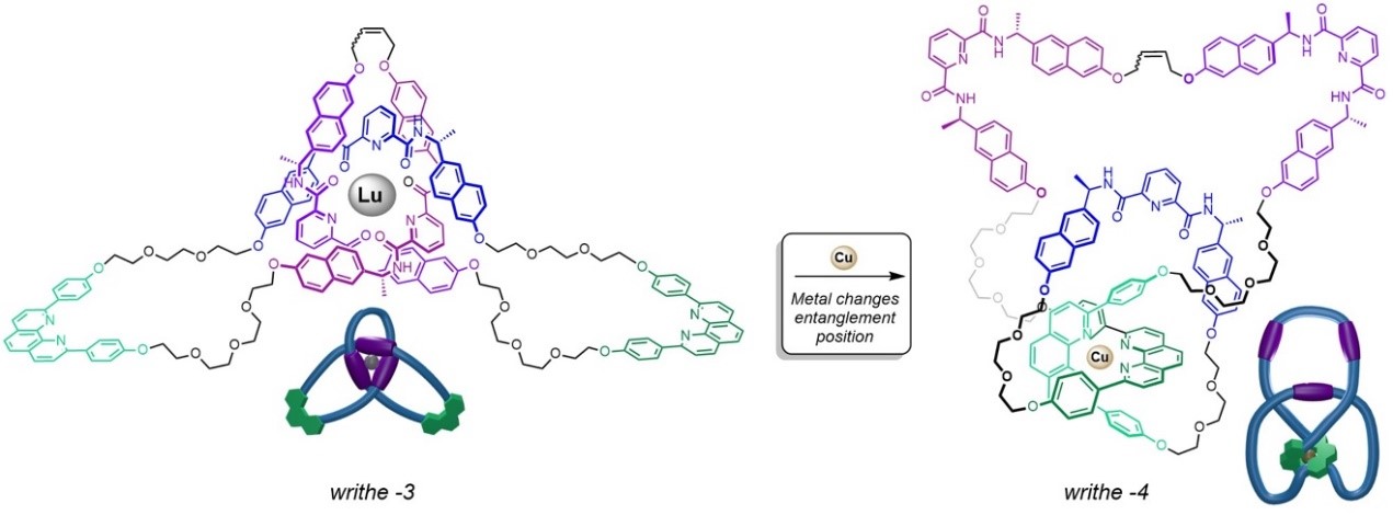与此同时,由于该结构内部存在正交的金属配位位点,因此在所形成31结结构内,通过添加不同的金属模板,可以实现结结构的运动,由原先的Cu位点转移至Lu位点,而这也是首次在单分子结结构中实现结点的运动,为后续研究蛋白结结构运动提供了可行性方案(图4)。