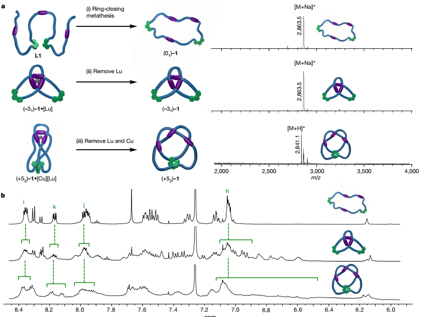 分子结52的合成由四步制备得到(图2)。首先配体L1与Cu(I)配位高效率地形成两种金属络合物(ΛCu和ΔCu); 第二步,由于配体中点手性的诱导,只有其中的一种构型ΛCu络合物能够与三价镥离子形成开链的分子52结; 第三步,通过烯烃复分解锁定开链结构得到金属分子52结; 第四,脱去两种金属离子制备得到有机分子52结。需要指出的是,分子结52的合成不受热力学控制,不同的金属离子添加顺序会产生不同的结果。实验结果表明,仅在先添加Cu (I)然后添加Lu (III)的条件下可以得到正确折叠的主要中间体(ΛCu,ΛLu)-L1•[Lu] [Cu]。研究人员通过核磁共振氢谱证实了1•[Cu] [Lu]的合成,同时圆二色谱(CD)的信号表明产物的拓扑结构和立体构型是(+52)–1•[Cu][Lu]。