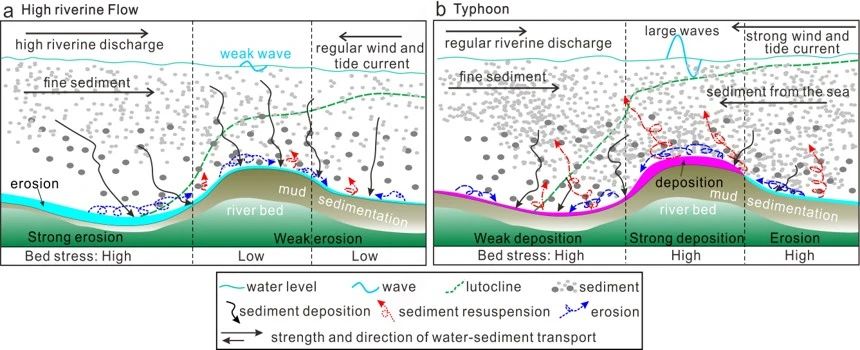 图2.高流量(a)和台风事件(b)导致的河口动力-沉积-地貌变化格局