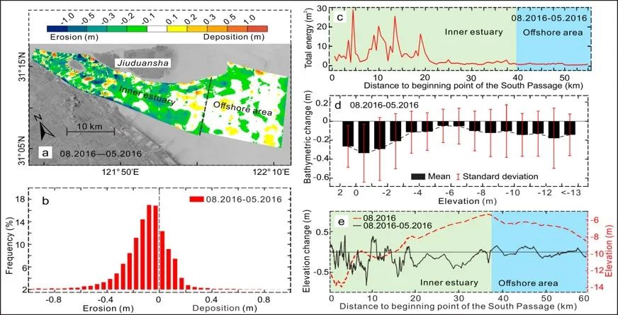 图1. 2016年5-8月洪季高径流引致的南槽动力地貌格局。(a)侵蚀-淤积空间分布;(b)侵蚀-淤积量级频率分布图;(c)基于1D-FTT的地貌变化能谱曲线;(d)地貌冲淤幅度;(e)深泓线沿程变化(黑色)及2016年8月深泓线(红色虚线)