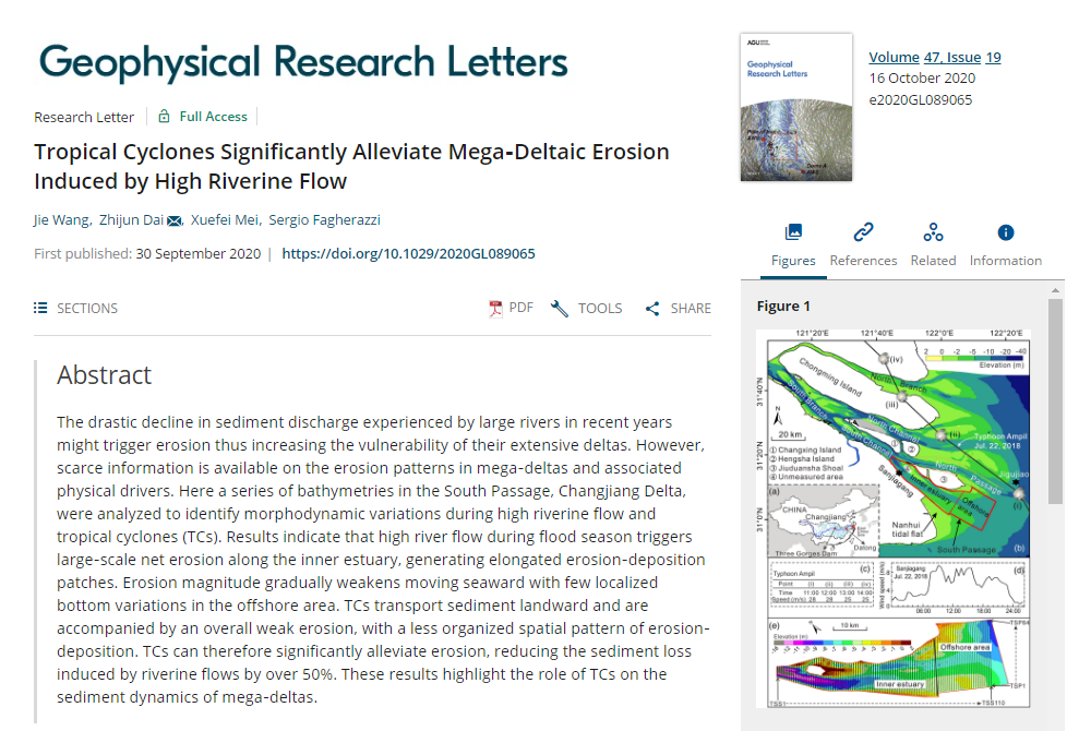 以Tropical cyclones Significantly Alleviate Mega-deltaic Erosion Induced by High Riverine flow 为题于10月8日发表在地球科学国际顶级学术期刊地球物理研究通讯 Geophysical Research Letters