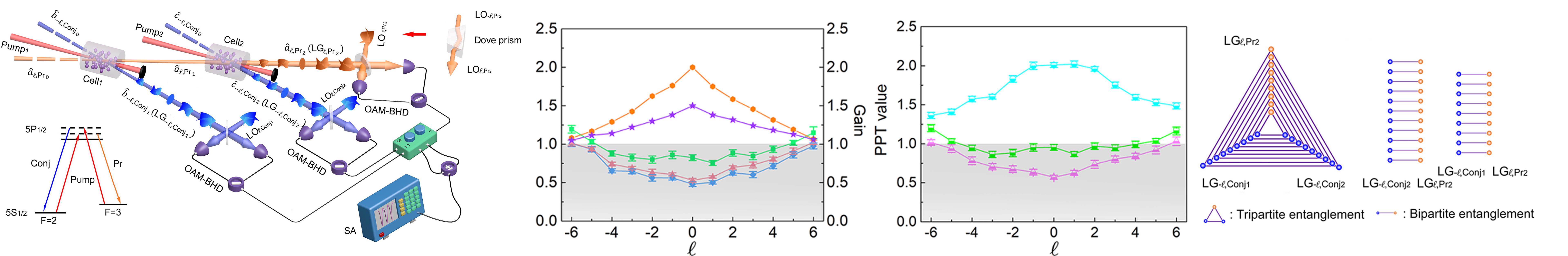 光学轨道角动量复用的三光束纠缠产生装置的示意图、三光束纠缠实验结果、两光束纠缠实验结果以及系统丰富的纠缠结构示意图