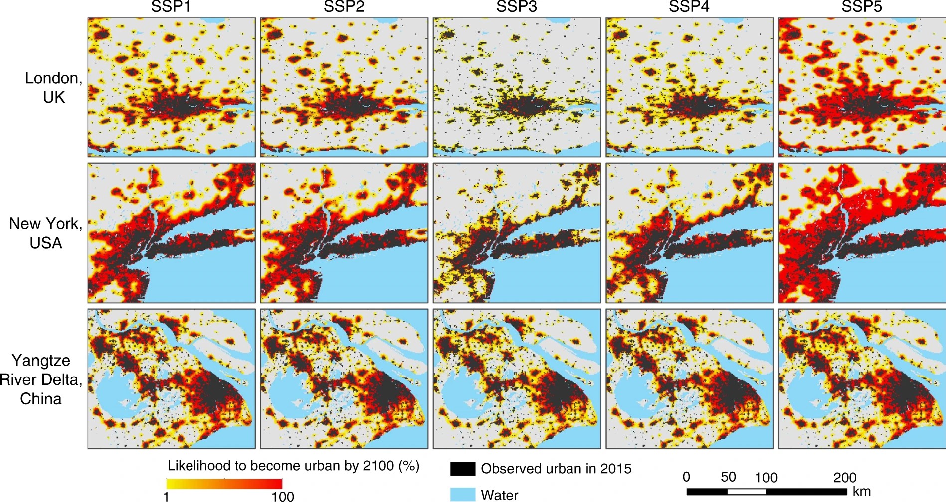 该研究通过对英国伦敦、美国纽约和中国长三角地区这三个全球超大城市群在2100年城市用地空间扩展概率分布后得出结论:未来全球主要经济体的城市扩张都将发生在大型城市群区域,并展现出高度的边缘性扩张特征。