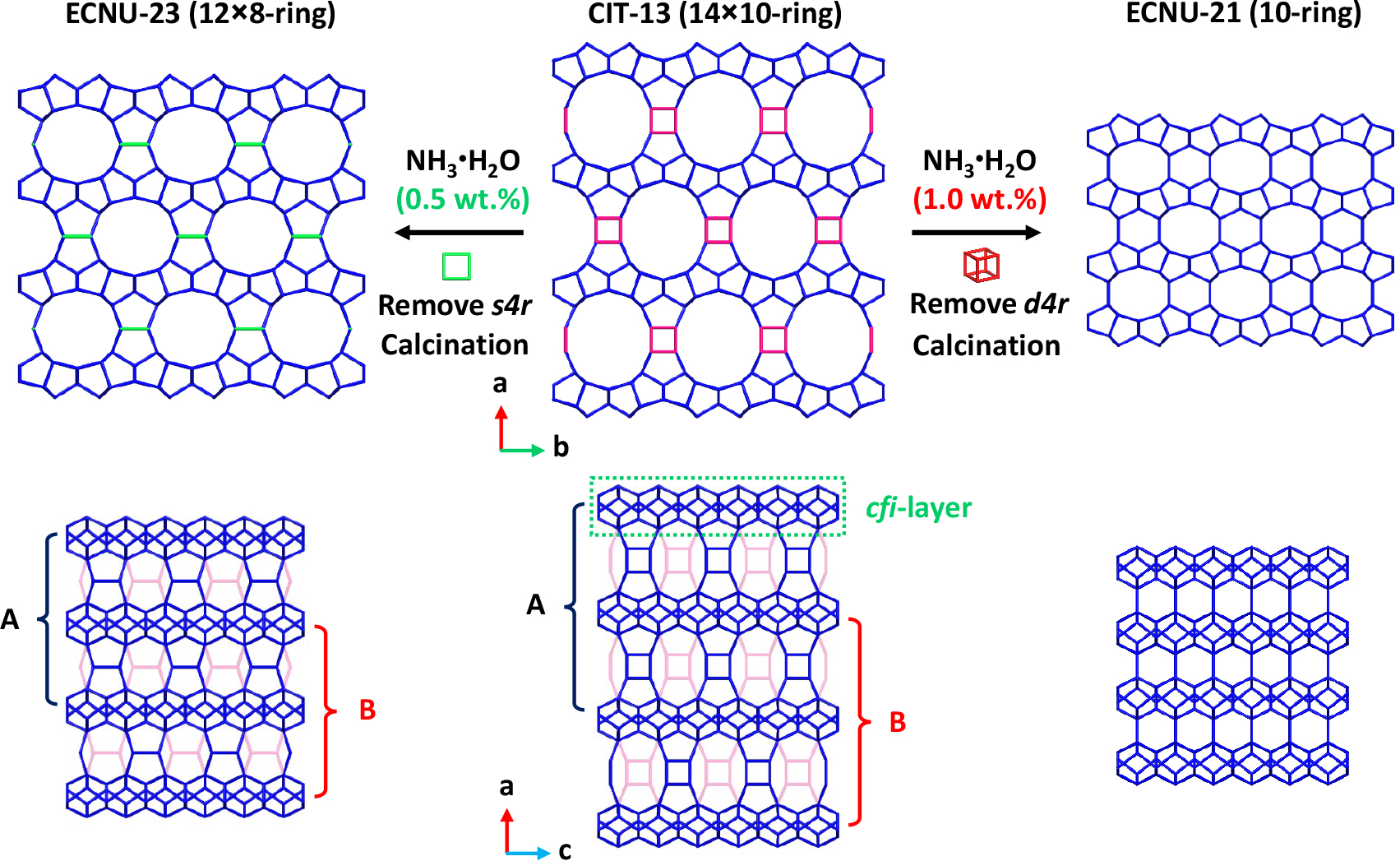 图2. CIT-13硅锗分子筛结构修饰创制新结构分子筛ECNU-21和ECNU-23