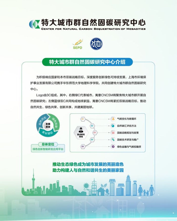 自然固碳是利用自然力量应对气候变化的重要方式,华东师大地理科学学院与上咨环保联合成立的“特大城市群自然固碳研究中心”,是长三角乃至全国第一家针对特大城市群从事自然固碳研究的绿色创新研发平台,中心研究工作将链通核算方法、政策规划、科技研发、技术推广、气候融资等五大环节,围绕特大城市群林业、农业、海洋等自然领域开展气候变化与碳循环、自然碳汇评估方法、固碳战略规划与政策、固碳技术研发与推广、绿色金融与气候投融资等研究工作,以智力服务助推生态绿色成为城市发展的亮丽底色,助力人与自然和谐共生的美丽家园建设。