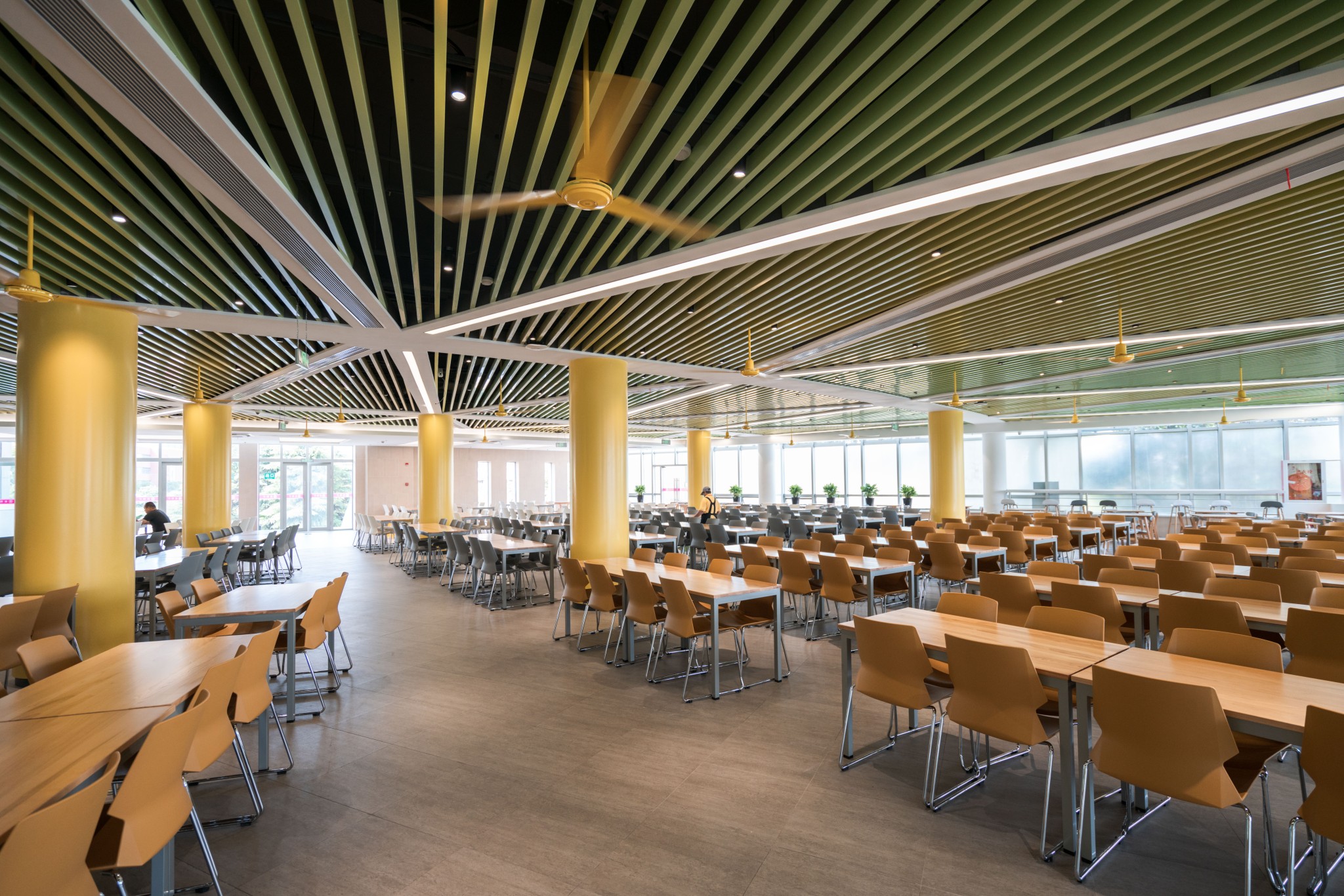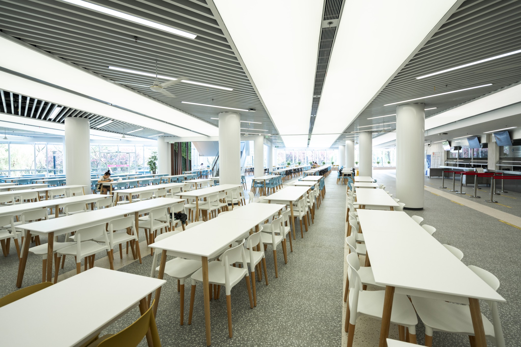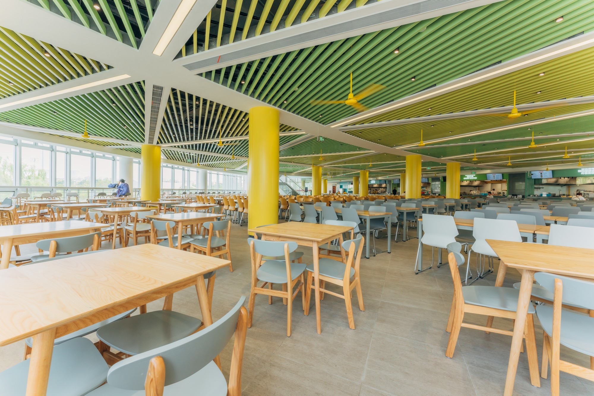 此次改造对原有结构不作改动,尽可能保留原有建筑元素。室内装修整体风格统一,以满足师生对就餐环境的需求,体现大学餐厅气质定位。木质桌椅与清新薄荷绿的餐具相得益彰。你喜欢吗?