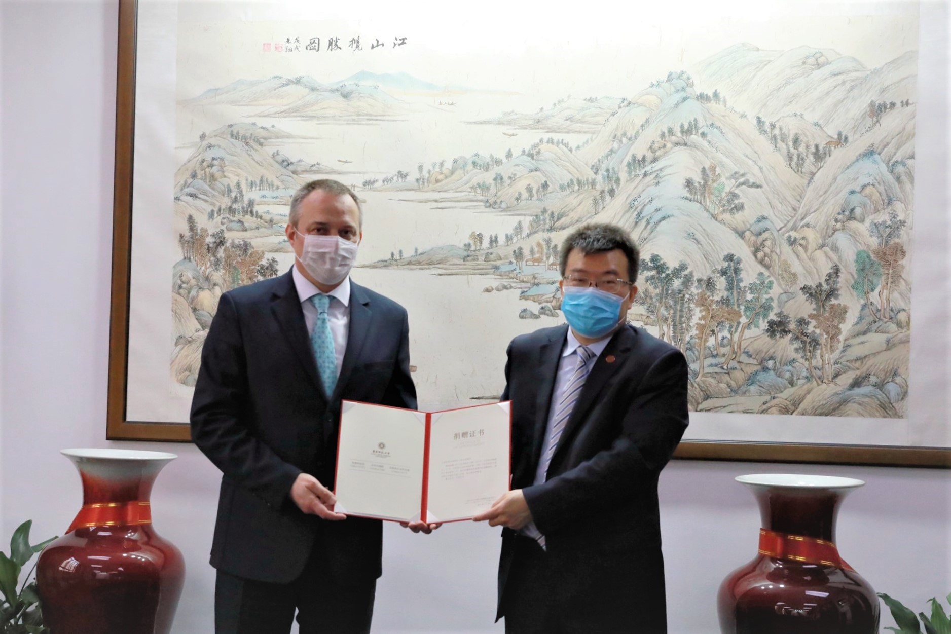 3月26日上午,白俄罗斯共和国驻沪总领馆总领事安德烈·安德烈耶夫一行来到中山北路校区,向我校捐赠了包括医用防护口罩、医用隔离衣、防护服、防护手套在内的一批防疫物资。副校长孙真荣向白俄罗斯驻沪总领馆送出了感谢信并颁发了捐赠证书。
