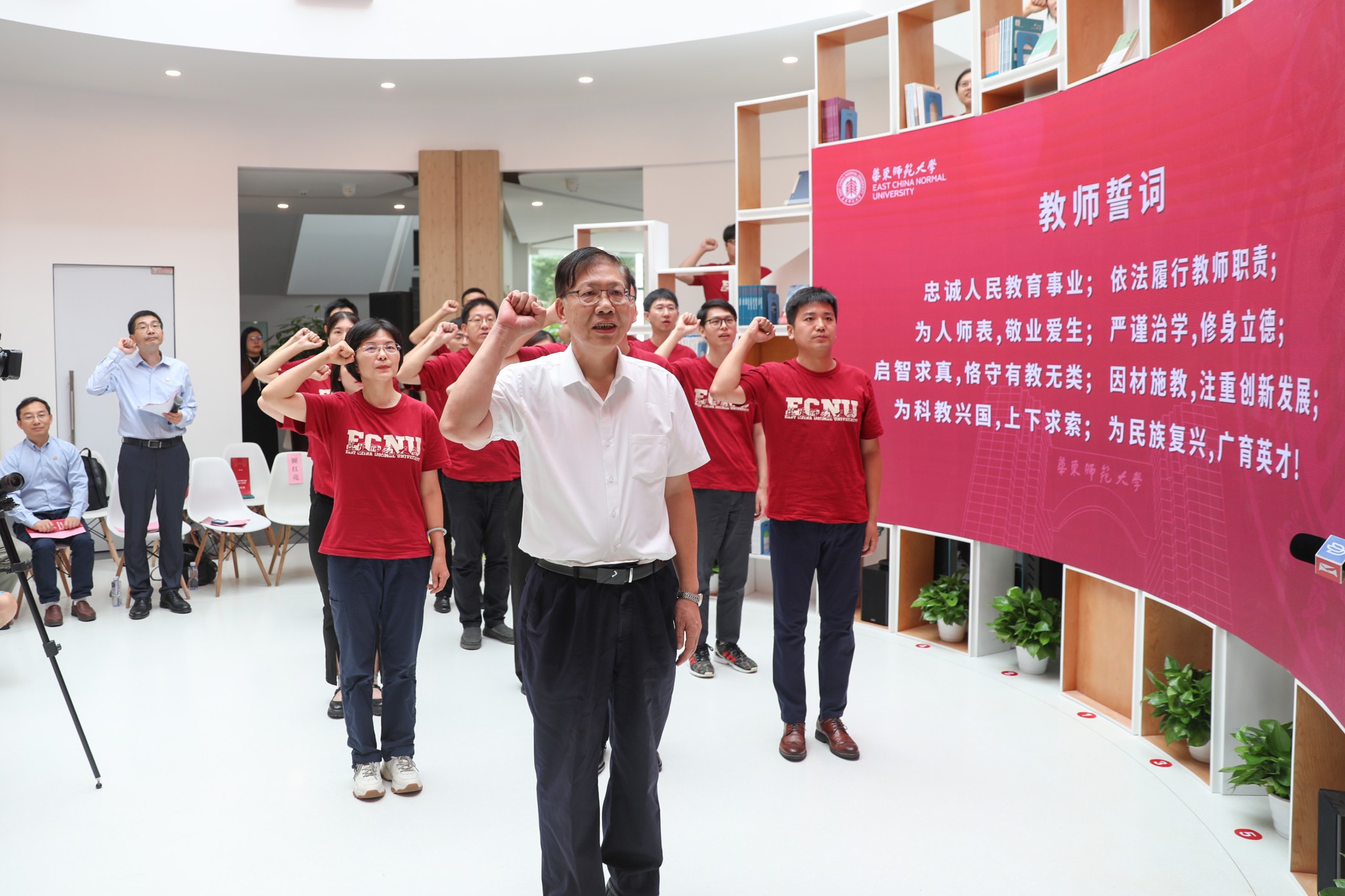 国家教学名师、华东师大地理科学学院郑祥民教授带领新入职教师代表面向国旗庄严宣誓