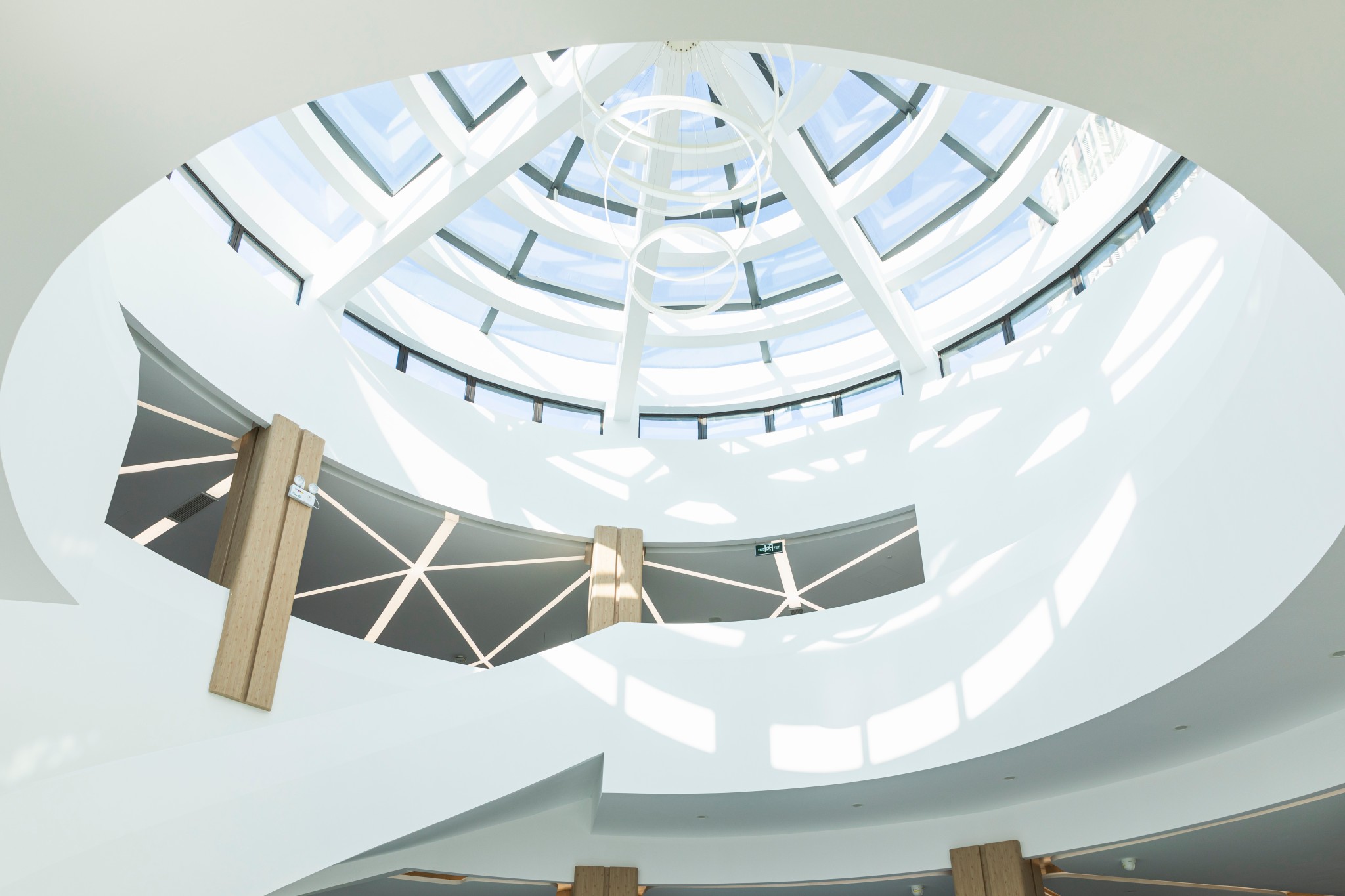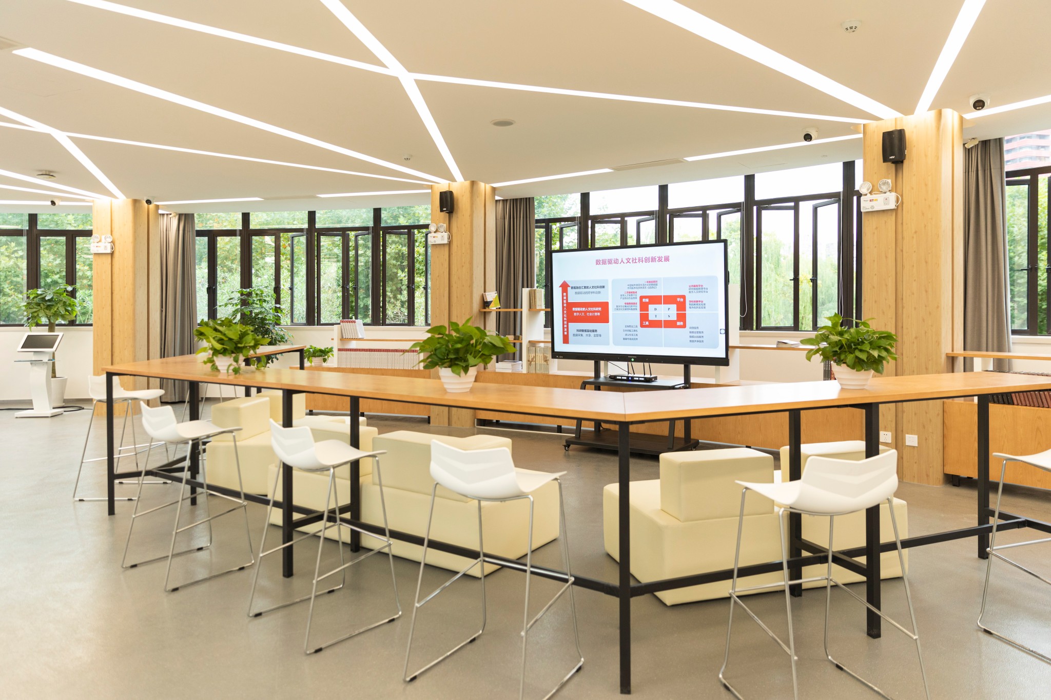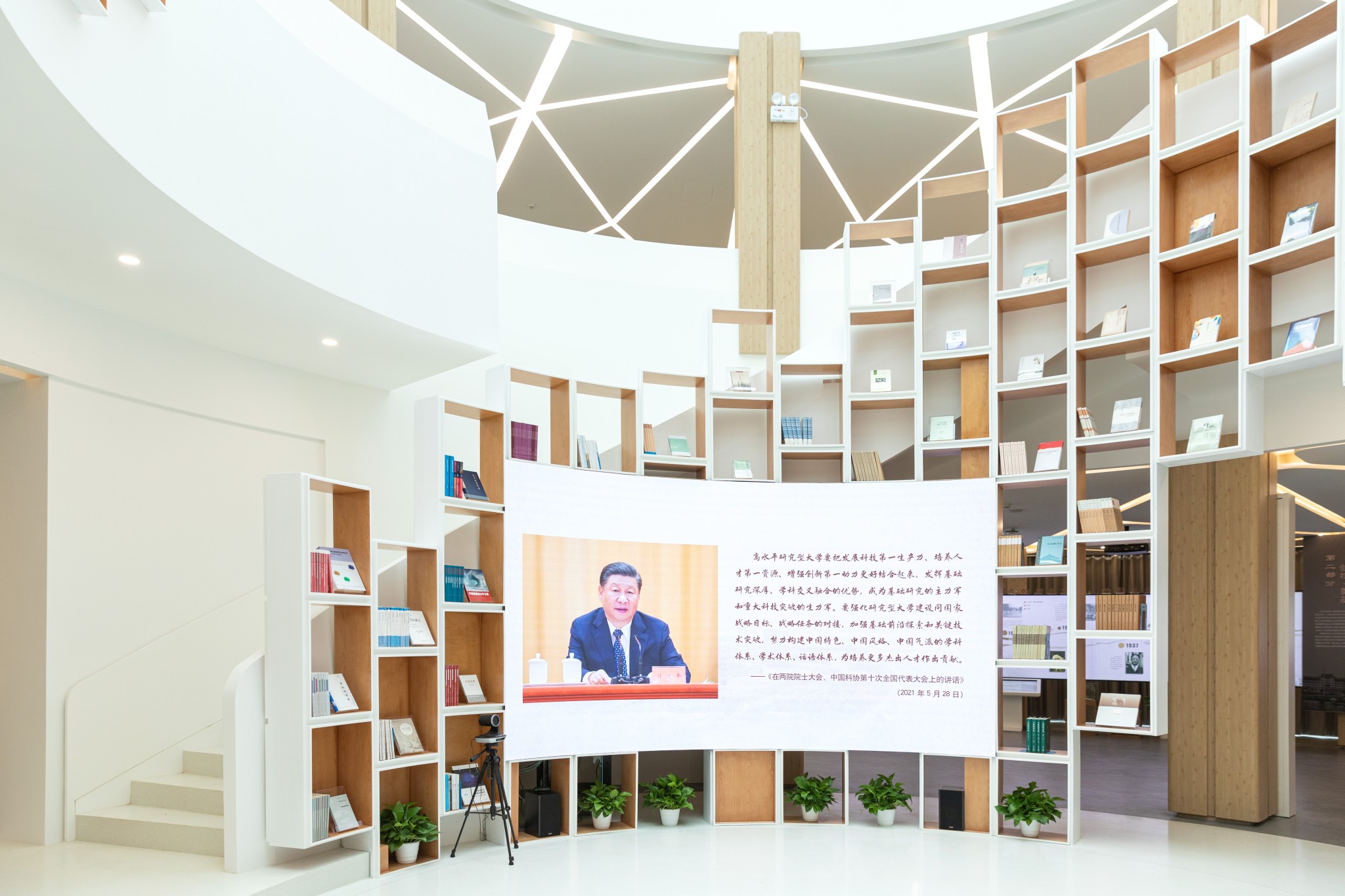 值得一提的是,从陈列室沿旋转楼梯而上,二楼便是卓越学术沙龙,这里汇聚了华东师大最新的人文哲社科研成果。如创新发展展区以大屏展示华东师大智能教育、城市创新、数据科学创新成果,公共服务区为日常学术研究活动提供便利,专业服务区包含数据银行、数据密室等数据存取终端。