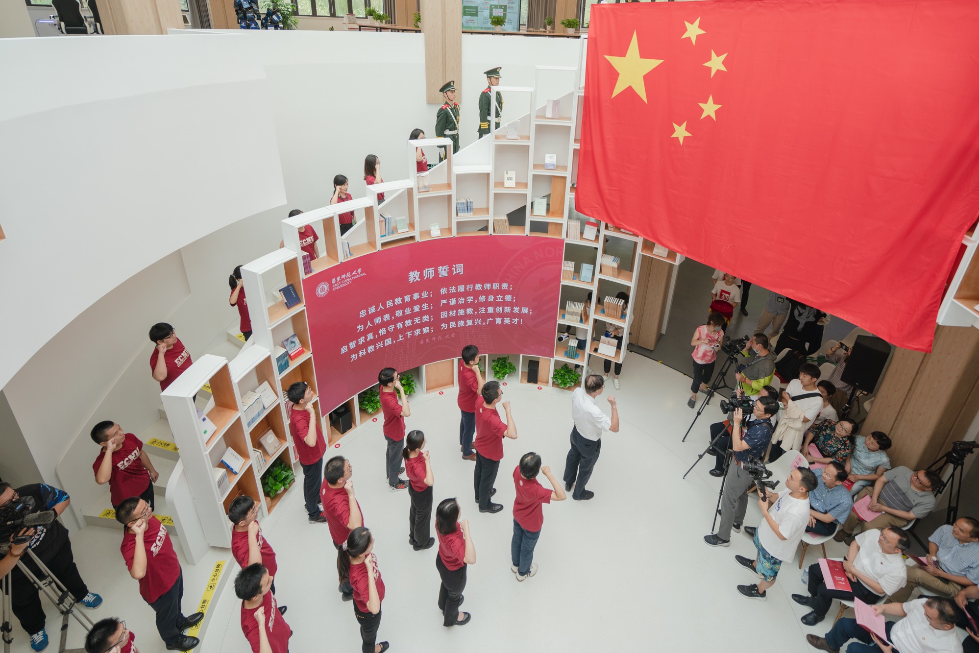 “为科教兴国上下求索,为民族复兴广育英才。”华东师大今年新入职的教师代表在国家教学名师、华东师大地理科学学院郑祥民教授的带领下面向国旗庄严宣誓。