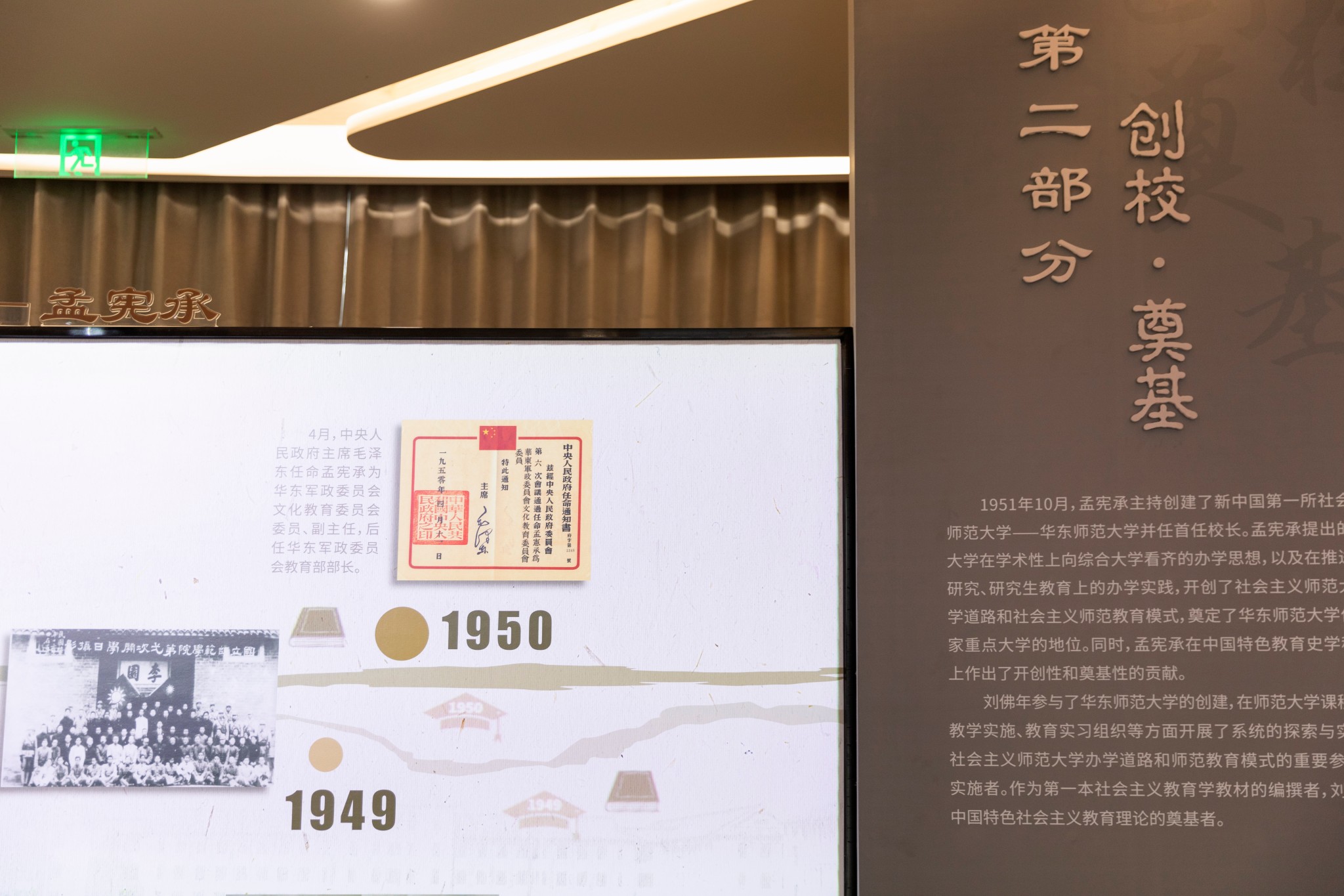 在第37个教师节和华东师大迎接70周年校庆的特殊时刻,“孟宪承·刘佛年教育成就陈列室”建成并正式开展,全景式呈现两位大师的办学道路和治学成就,展示了中国特色教育理论创新与实践成果,尤其生动再现了两位大先生壮阔而温润的现实关怀。