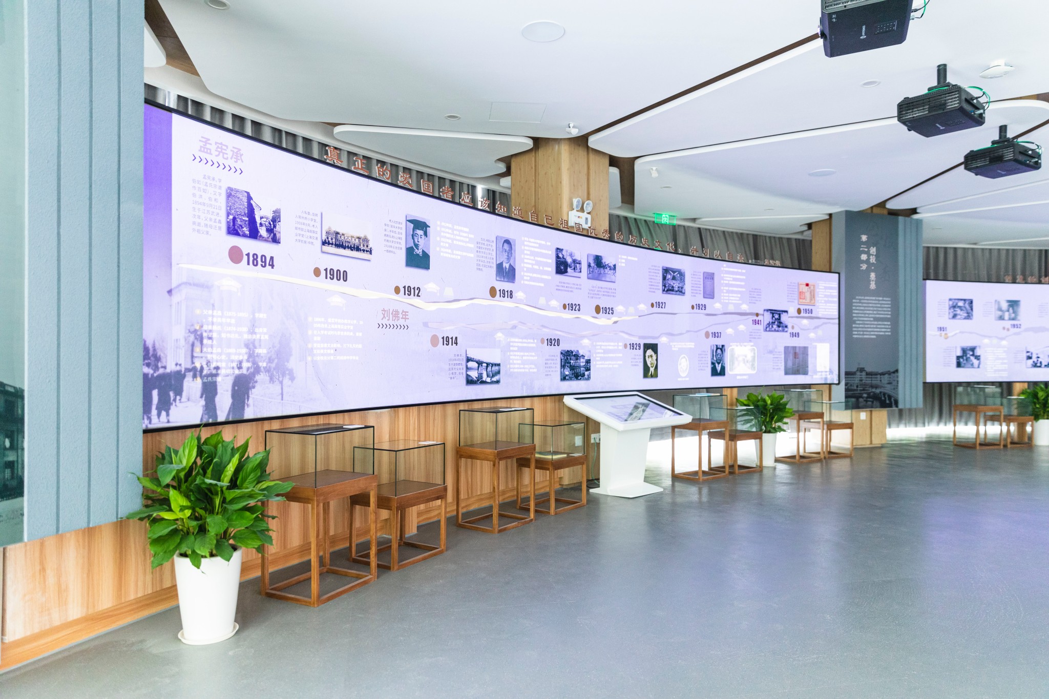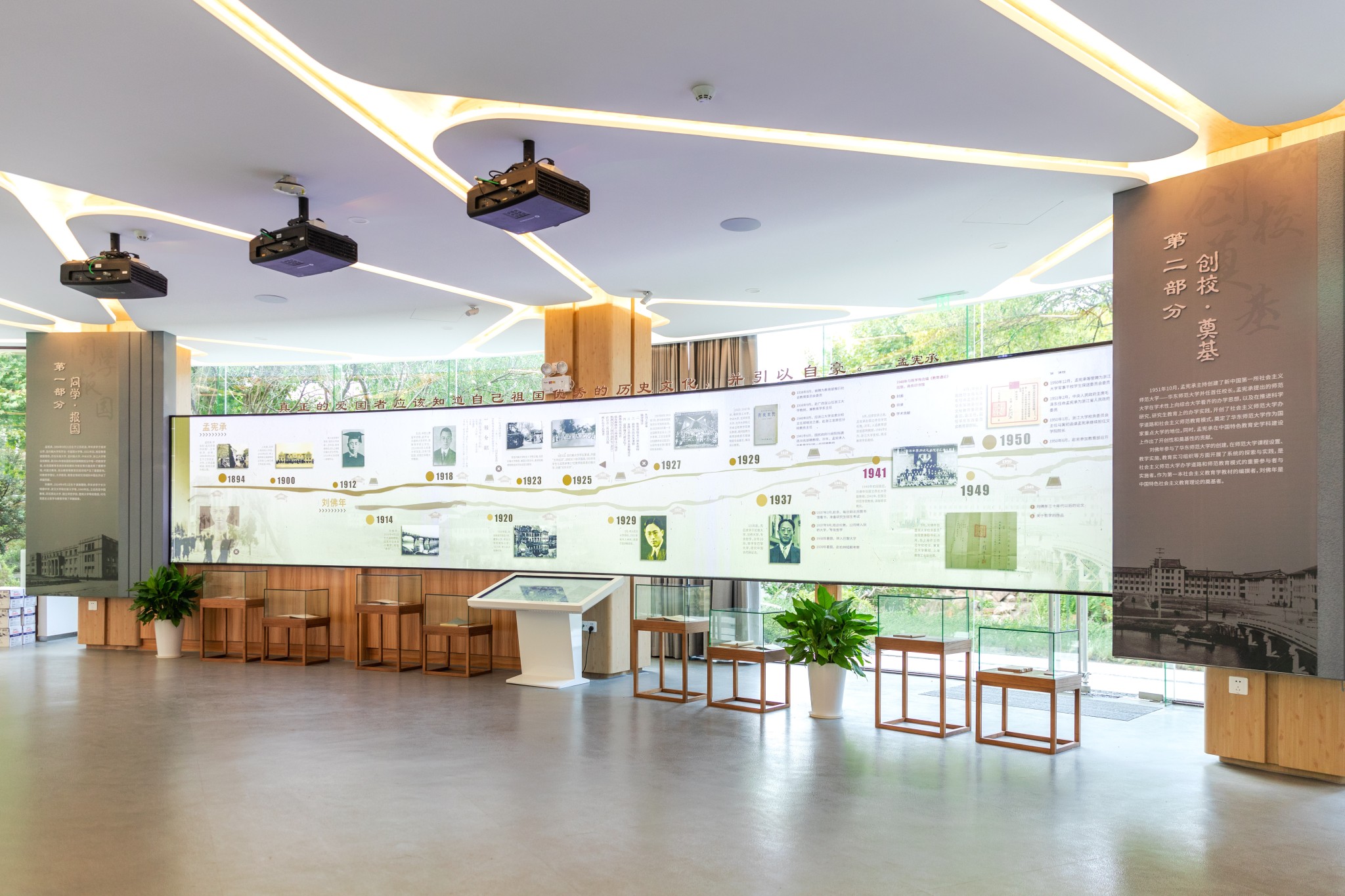 孟宪承·刘佛年教育成就陈列室通过珍贵的文献、实物和400余张图片,创新引入最新数字媒体交互技术和虚拟现实技术,采用传统布展与红外线互动投影、CAVE虚拟现实沉浸式系统、口述历史访谈影像相结合的形式,图文声像并茂地展现两位先生的教育学术研究成果。