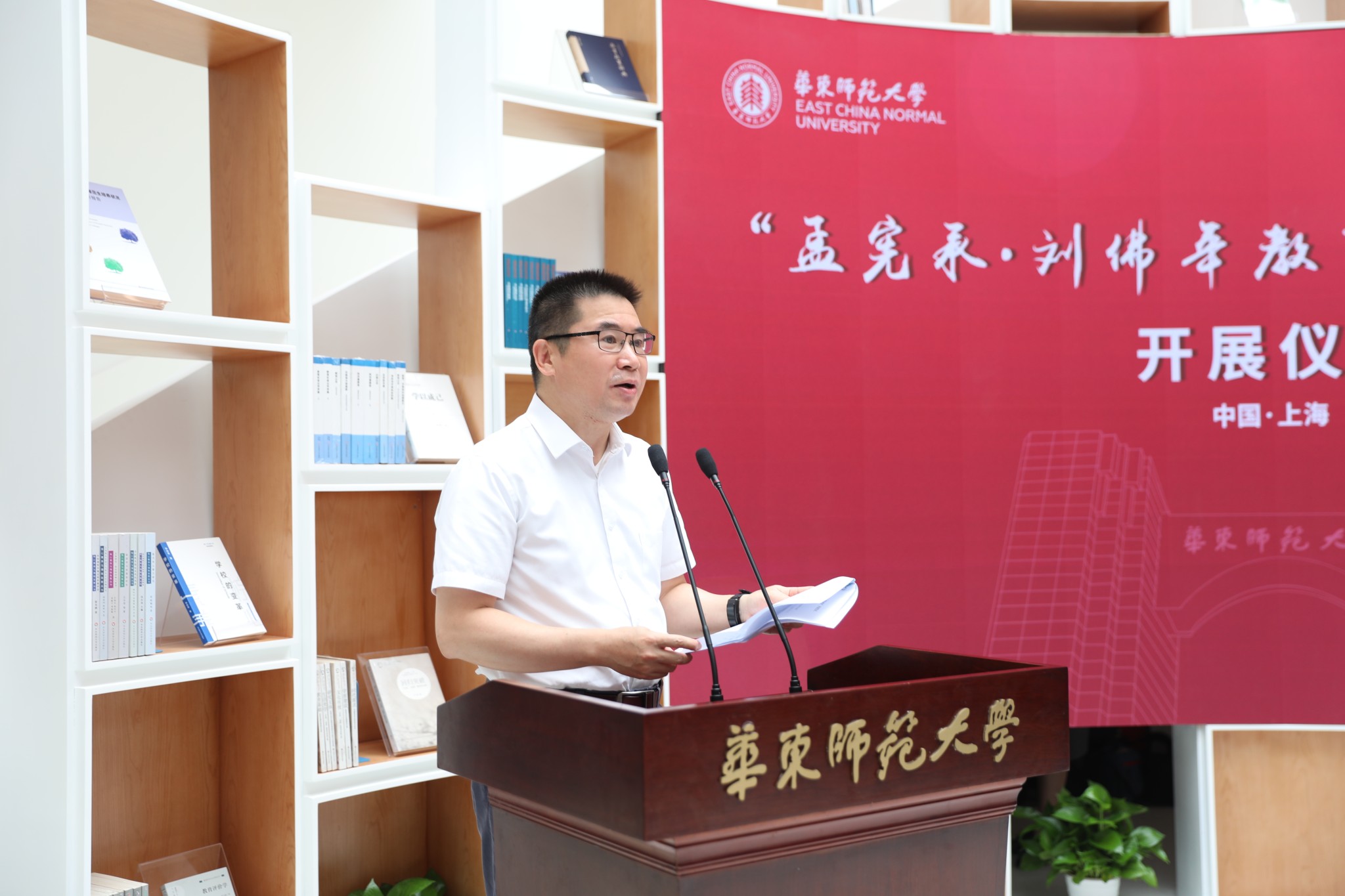 上海市委宣传部副部长徐炯、市教卫工作党委书记沈炜、市社联党组书记王为松、孟宪承先生弟子代表江铭、刘佛年先生弟子代表顾泠沅、华东师大党委书记梅兵和校长钱旭红一同为陈列室揭牌。
