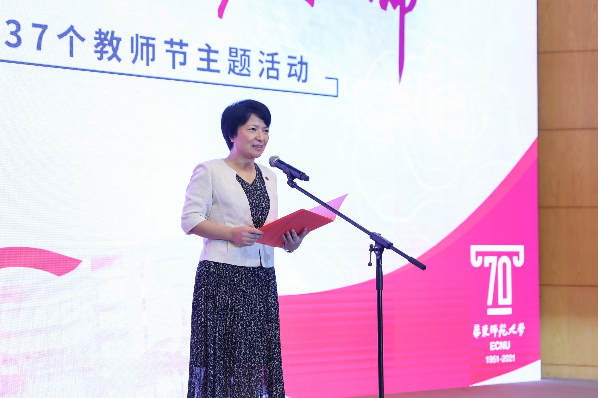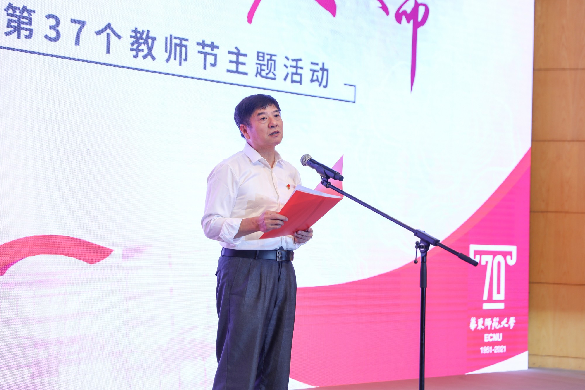 梅兵强调,在建党100周年、建校70周年这个特殊年份,在这个教师自己的节日里表彰上海市育才奖获得者和30年教育工作龄的老师,既是为了弘扬学校为党育人、为国育才的先进教师典型,更是为了激励广大教师不忘“人民教师”的初心使命。过去的一年,全校教职工以卓越奋进的姿态,一手抓疫情防控,一手抓事业发展,在教学、科研、社会服务等方面作出了优异的成绩。这是老师们用实际行动勇担“育人”“文明”“发展”三大使命的生动写照,也是对“求实创造、为人师表”校训精神的生动传承。希望全体师大教师站在新百年、新七秩的起点,面向“十四五”规划和新一轮“双一流”建设任务,传承前辈大师“国家兴亡,匹夫有责”的教育情怀,潜心治学、淡泊名利的职业操守,诲人不倦、育人为乐的师者风范,生命不息、奋斗不止的人生境界,努力成为传播知识、传播思想、传播真理,塑造品格、塑造品行、塑造品味的“大先生”,更好地承担起培养担当民族复兴重任的时代新人的历史使命。
