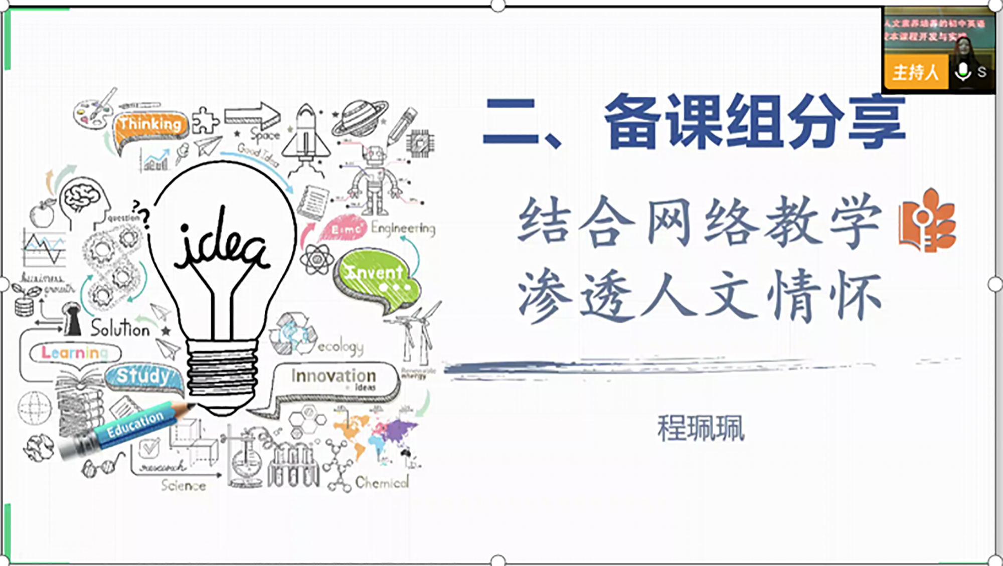 嘉华二的程珮珮老师以“结合网络教学,渗透人文情怀”为题进行了分享。她通过牛津英语上海版9A Unit 3 Head to Head一例具体呈现如何通过课前、课中、课后为学生创设不同人文活动,充分展示了老师在营造人文氛围和引导学生自我提升人文素养方面的实践成果。