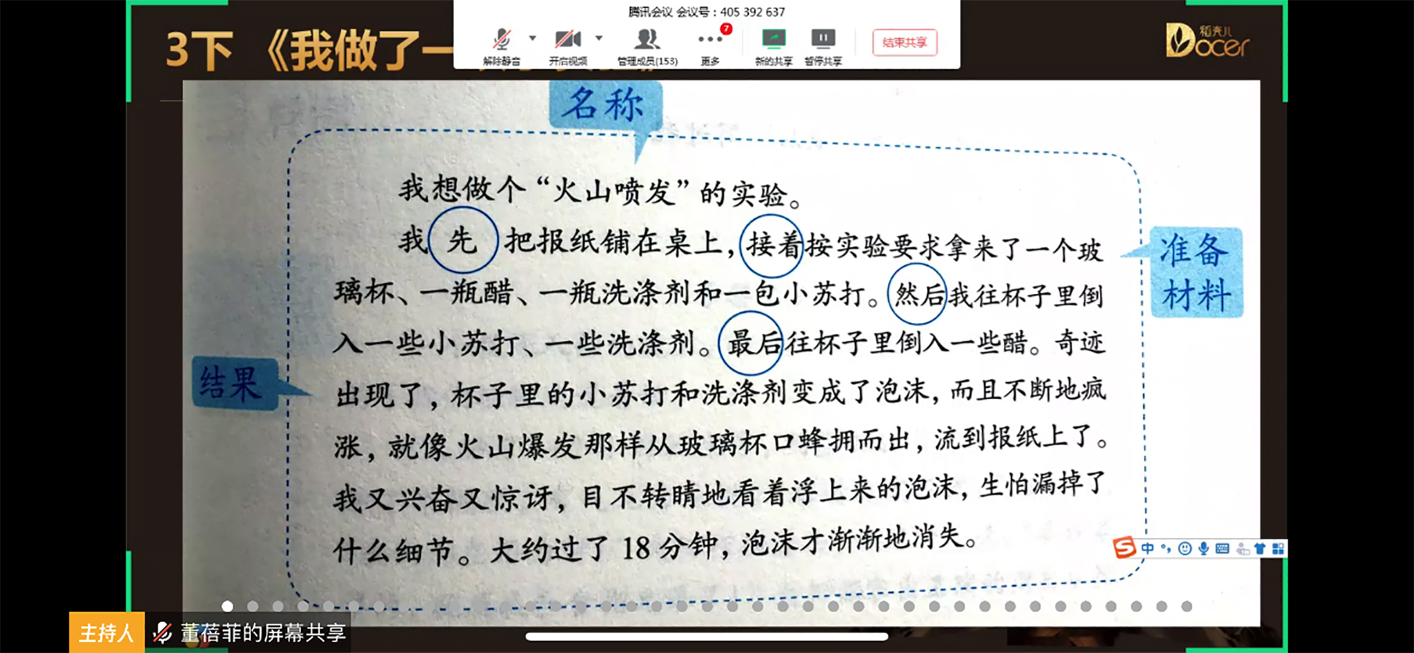 董教授以五年级《写读后感》为例,向大家展示了习作清单的构成要素和设计流程。在此基础上,又通过小学语文二、三、四、六年级习作清单的案例,生动展示了如何将清单习作的四环节运用于实践教学之中。在此过程中,董教授注重网络教研中小步递进的学习方式,循序渐进地设置了多项随堂练习,帮助各附校教师们通过完成一个个小任务,充分理解和掌握清单习作的教学步骤。