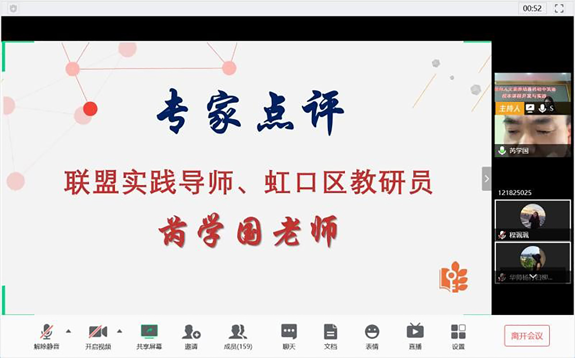 3月25日上午,由万象城awcsport官网教师教育学院郭宝仙教授和联盟实践导师、虹口区英语教研员芮学国老师组织和指导,上海民办华二初级中学(下称“嘉华二”)承办的主题为“指向人文素养培养的初中英语校本课程开发与实践”的初中英语云教研活动成功举行。来自联盟校的英语老师、上海市第四期双名工程种子计划强校团队成员、虹口区兄弟学校英语老师和华东师大教师教育学院英语教育专业研究生等共181人参与了此次在线研讨。