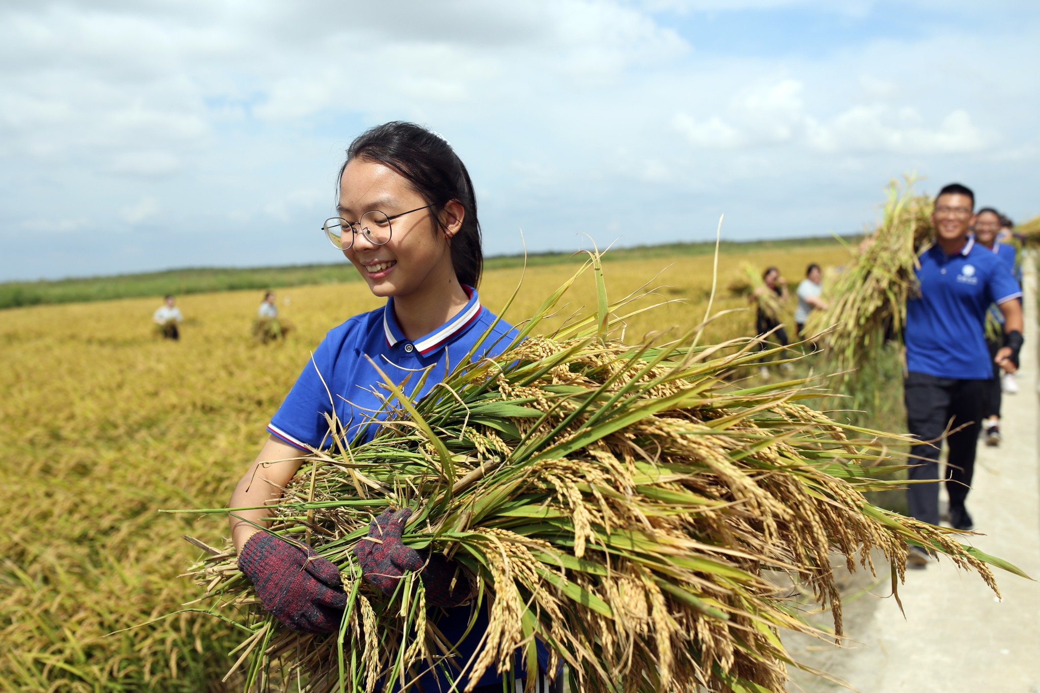 “随着稻香河流继续奔跑,微微笑……”,9月25日,来自华东师大五十多名师生们又相聚于横沙岛东滩,举行“幸福生态米”开镰仪式,学生们一边哼唱着歌曲《稻香》,一边戴起草帽、撸起袖子、“变身”农民,一头扎进农田收割新一季的水稻。