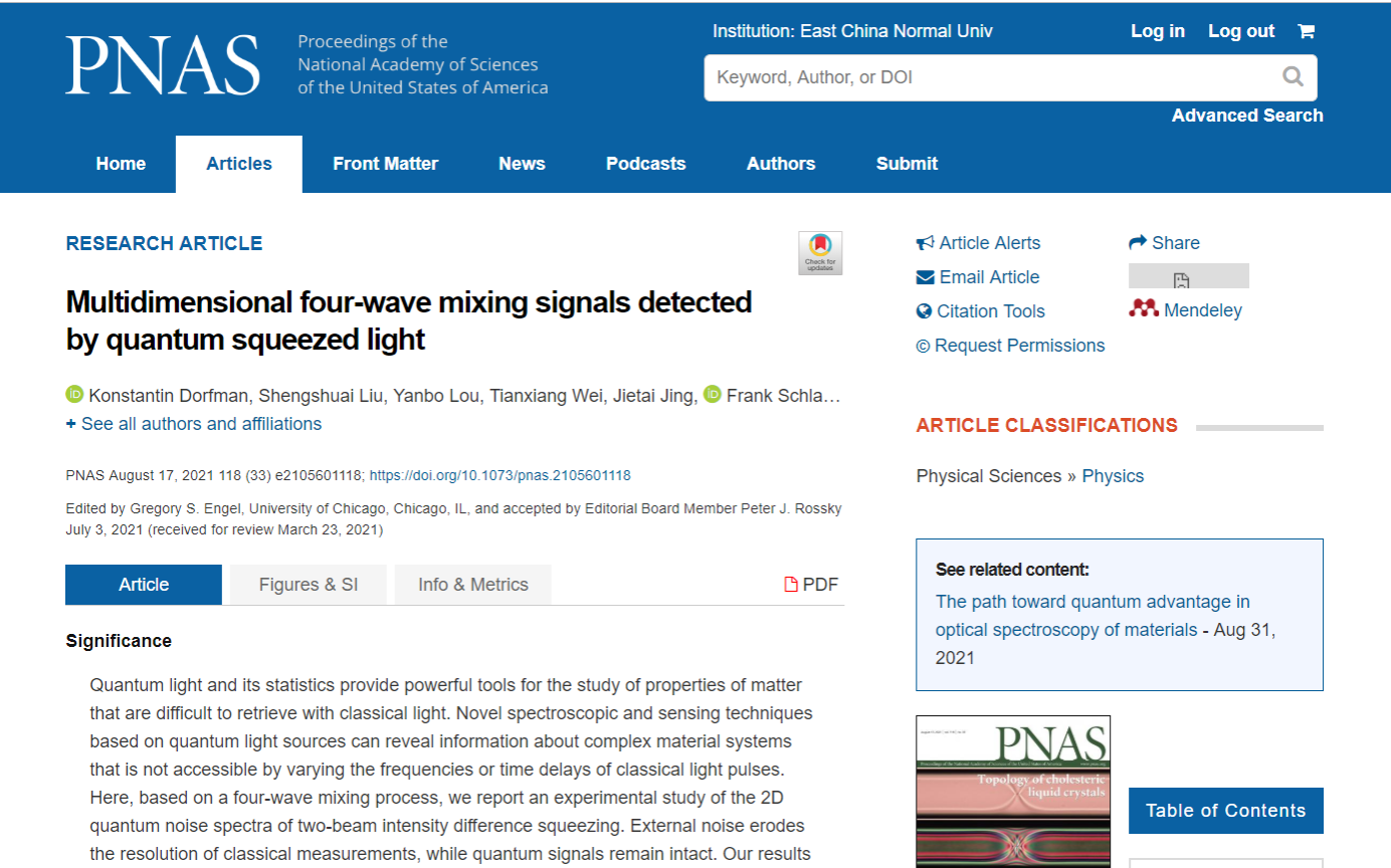 相关结果以“Multidimensional four-wave mixing signals detected by quantum squeezed light”为题发表在国际著名学术期刊《美国国家科学院院刊》(Proceedings of the National Academy of Sciences of the United States of America)PNAS118,e2105601118 (2021)上。这项工作是在Konstantin E. Dorfman教授、荆杰泰教授、Frank Schlawin博士以及Shaul Mukamel教授的合作下完成的。Shaul Mukamel教授是华东师大的客座教授。万象城awcsport官网为第一完成单位,精密光谱科学与技术国家重点实验室的Konstantin E. Dorfman教授、刘胜帅副研究员和娄彦博博士为论文共同第一作者,魏天祥硕士对实验部分也作了重要贡献,Konstantin E. Dorfman教授和荆杰泰教授为论文的共同通讯作者。