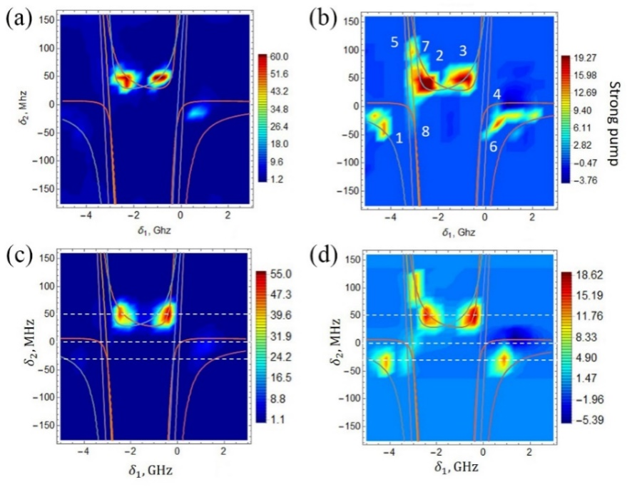 如图1所示,在实验中,该合作团队首先通过光学分束器对激光进行分束。其中较强的一束用来作为四波混频过程的泵浦光,另外较弱的一束通过声光调制器产生实验所需的探针光。之后,泵浦光和探针光在铷原子蒸气池中心交叉并发生四波混频过程,从而产生具有量子关联的探针光和共轭光。接着,该团队将产生的探针光和共轭光分别打入光电探测器进行对四波混频增益以及量子关联的测量。探针和共轭光束之间的量子关联以及四波混频过程的增益携带了光谱信息。这些信息包括电偶极矩、能级跃迁和斯塔克能移。之后,该团队改变四波混频过程的单光子失谐、双光子失谐和泵浦光强度进行增益以及量子关联测量,从而得到了图2(a)基于增益以及图2(b)基于量子关联的二维光谱实验数据。在得到实验结果之后,该团队还进行了相应的理论模拟。通过使用微观模型计算了三阶非线性极化率,其中包括强泵浦引起的斯塔克能移。
