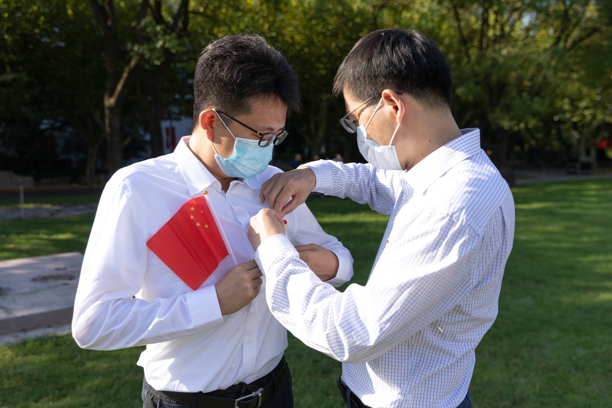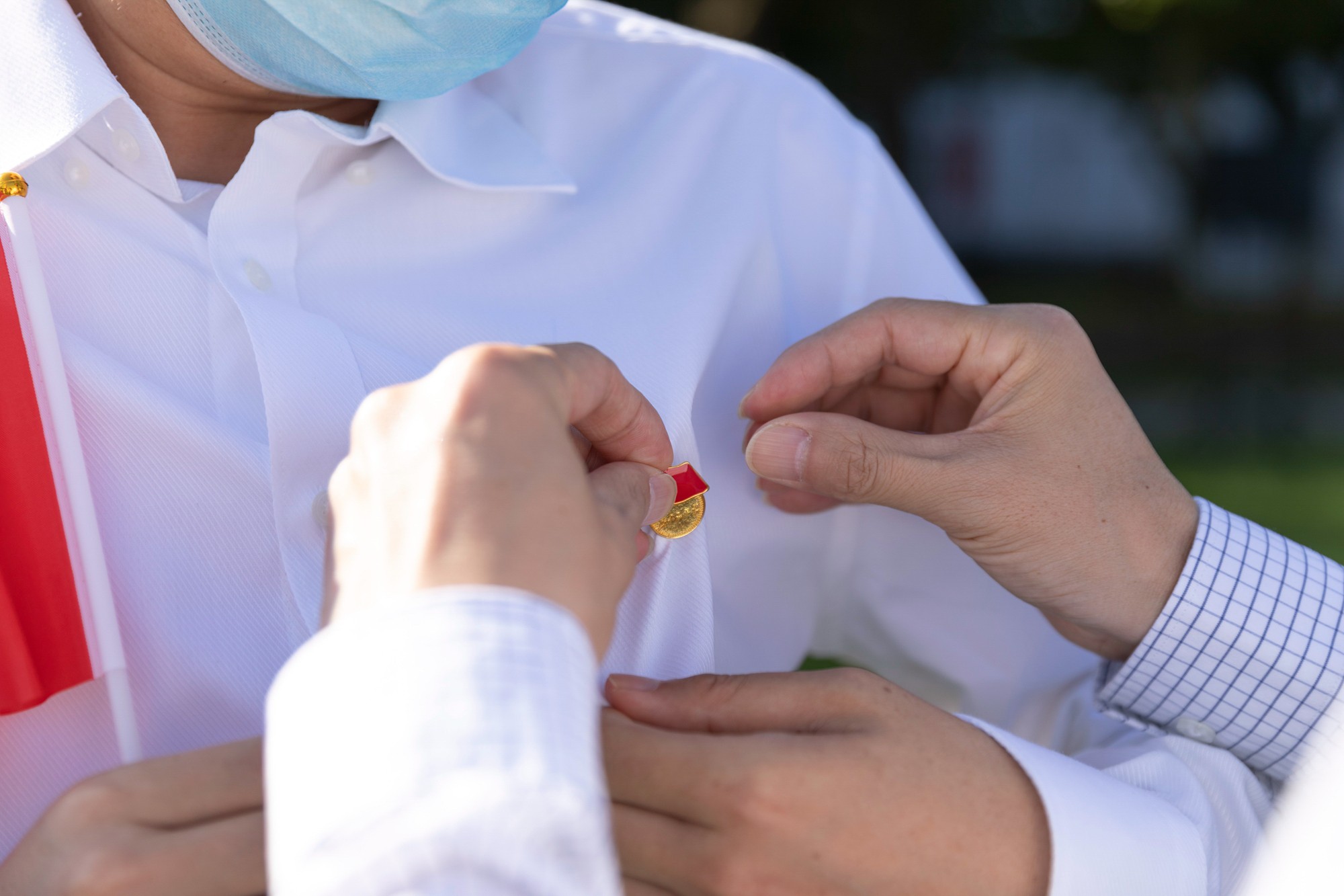 站在红旗下,顾红亮为支部党员代表佩戴党徽。党支部书记车文漪表示,支部全员将继续在学习实践中增长才干、练就本领,以真才实学服务人民,胸前闪闪发光的党徽,将激励我们在理想之路上胸怀鸿鹄之志,走得更远。