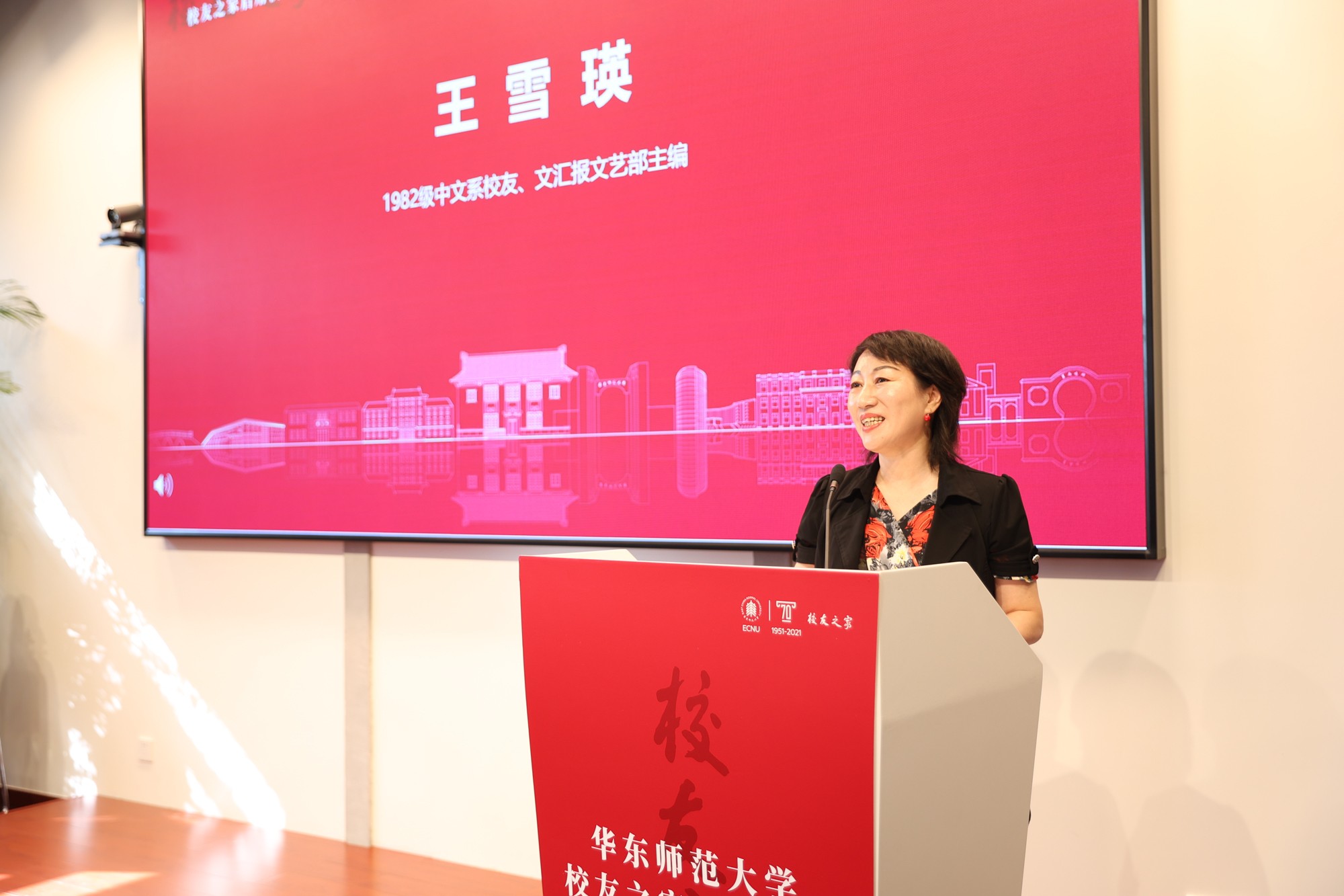 1982级中文系校友、文汇报文艺部主编王雪瑛代表校友发言