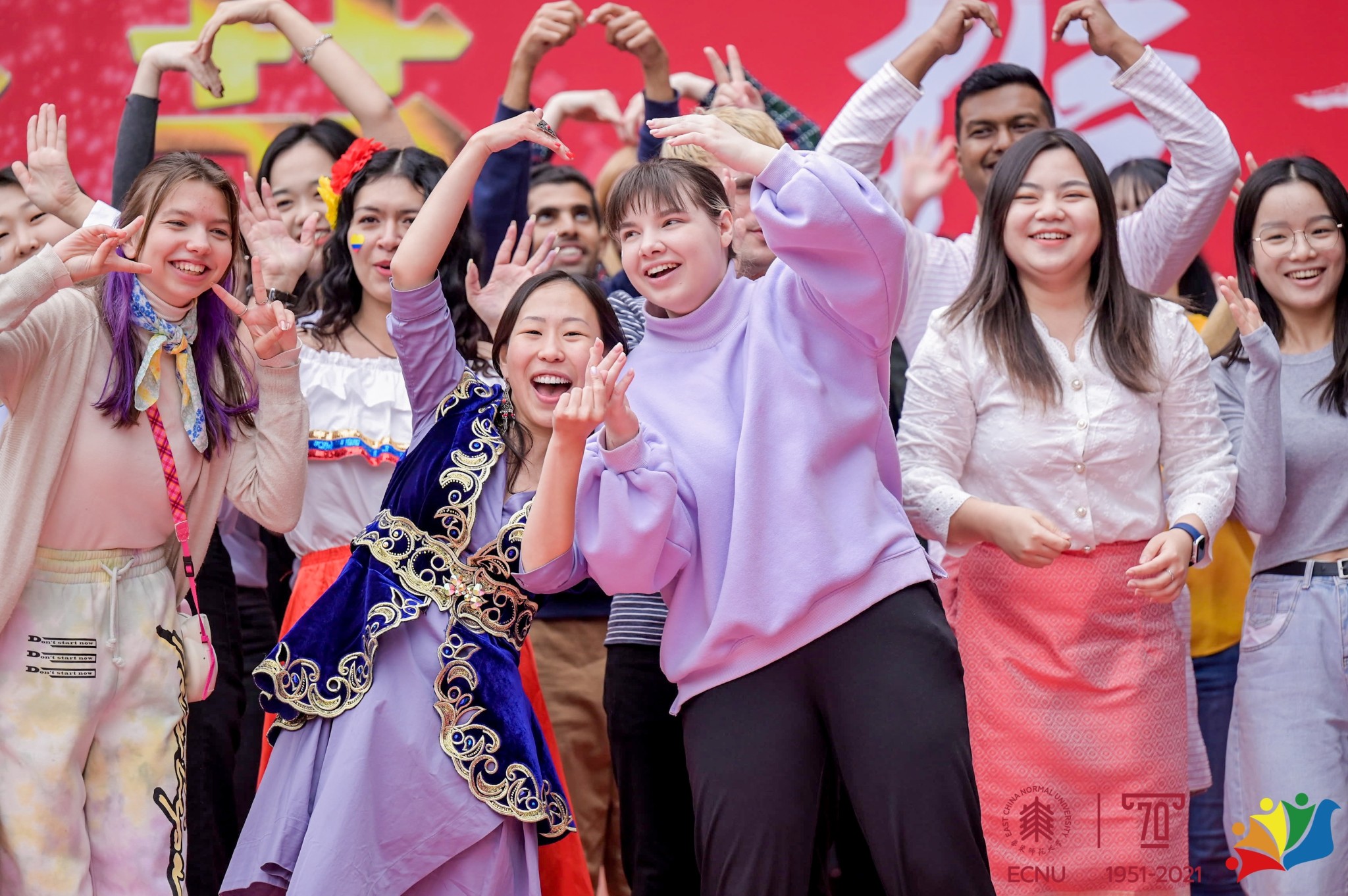 舞台上、展位间,中外学生们一起载歌载舞,观众们也随着韵律舞动起来。“中外一家,携手同行”,迷你博览会充分彰显了华东师大多元文化的魅力与氛围。