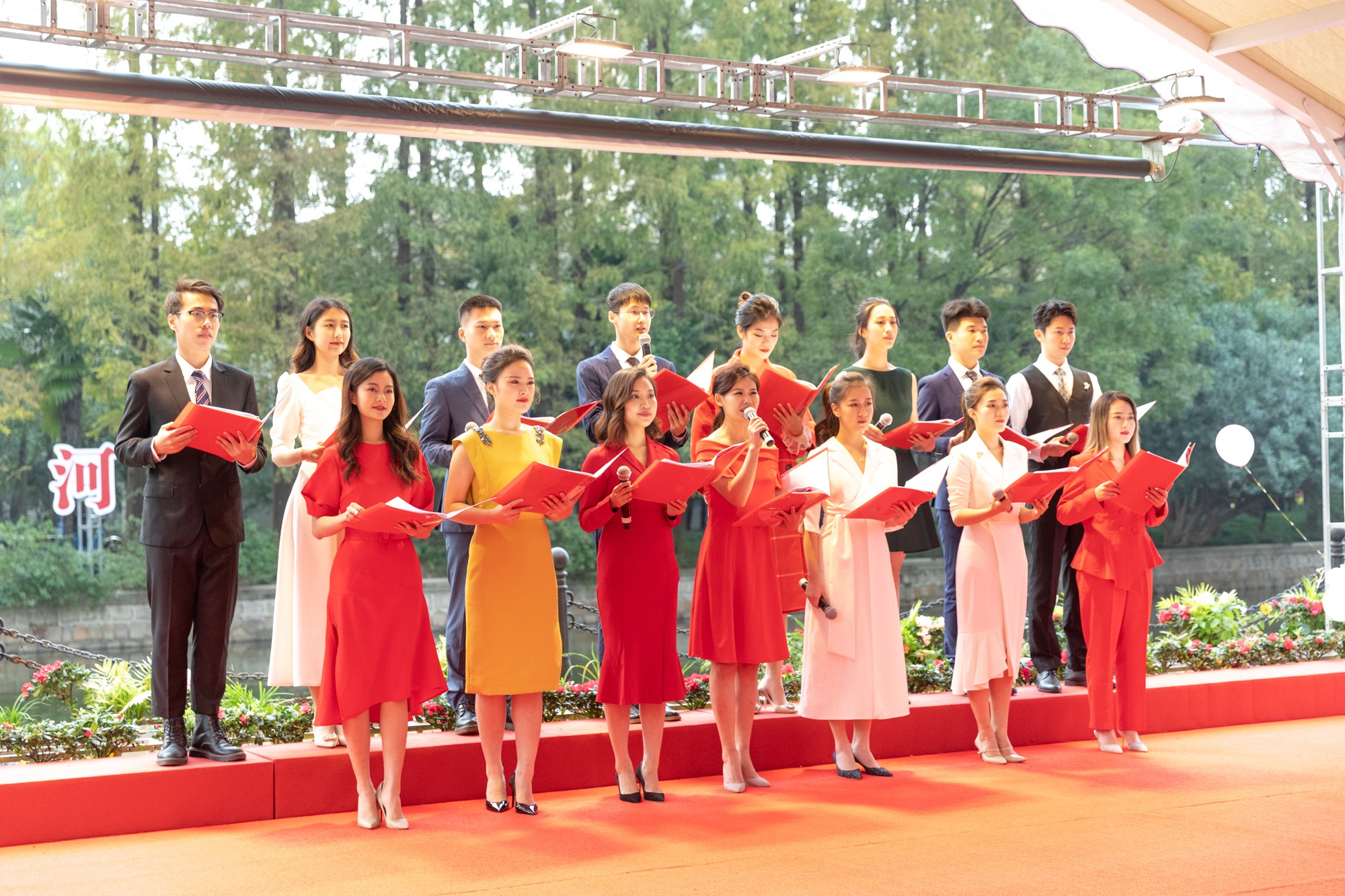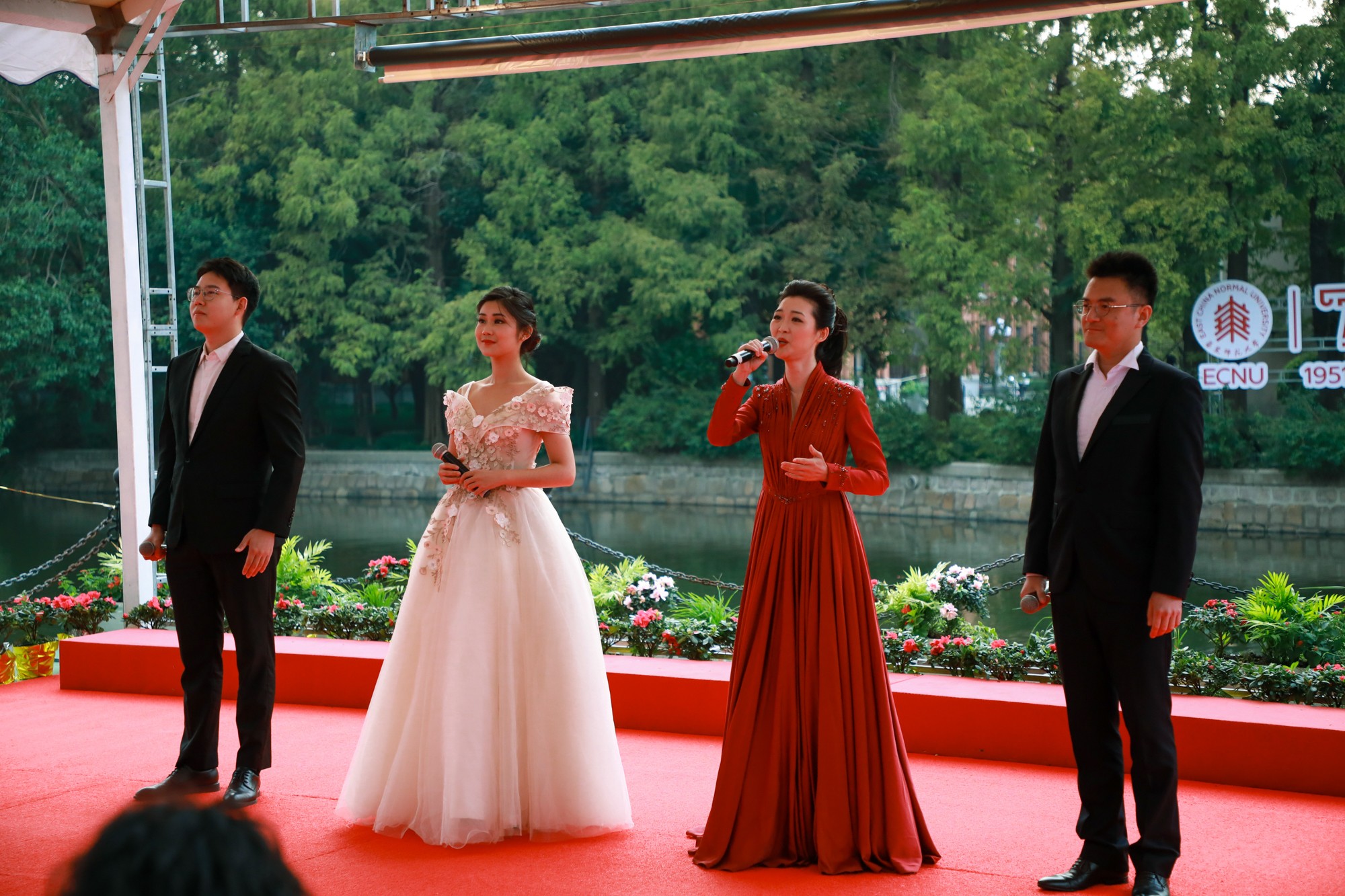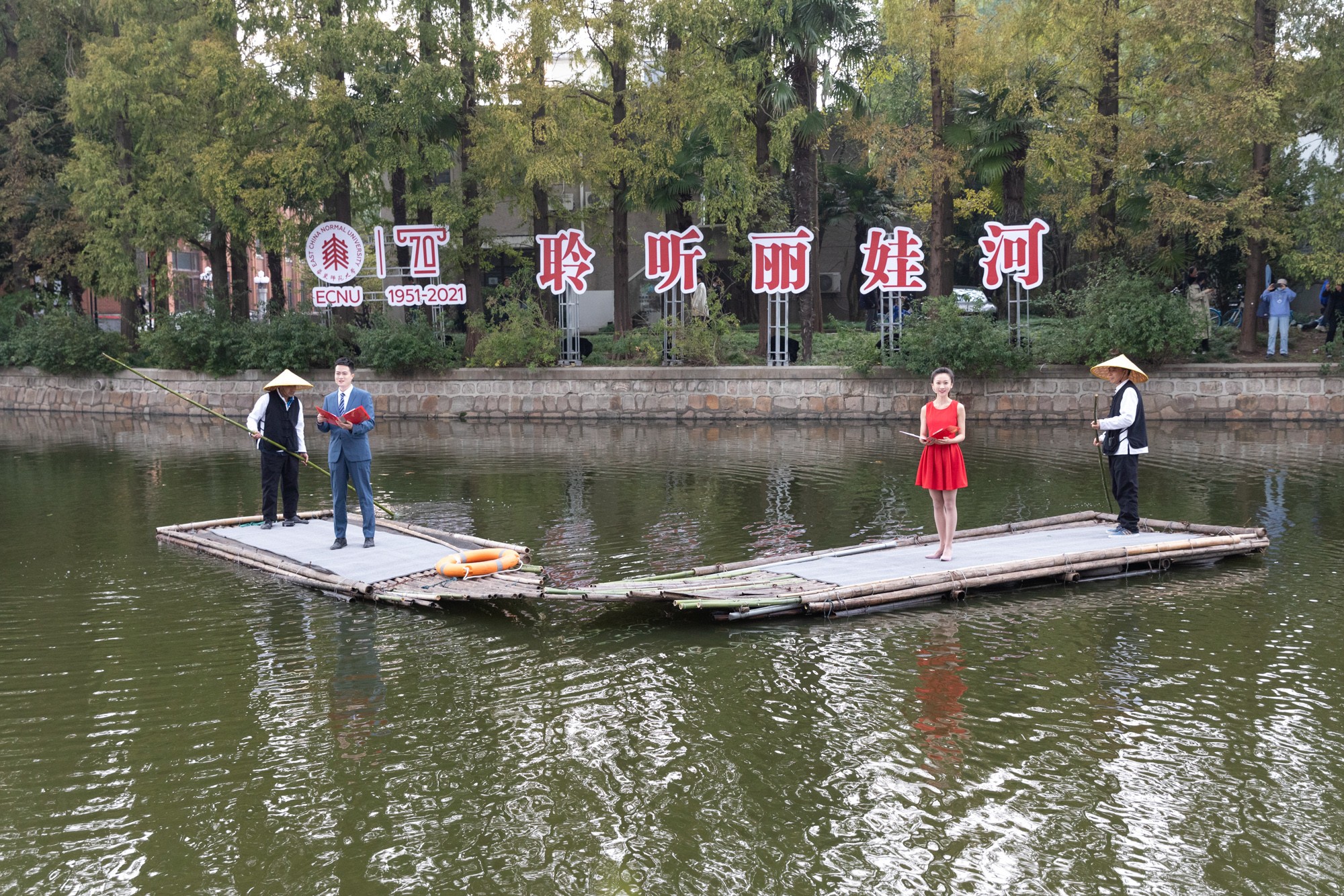 由音乐学院学子带来的二重唱《船歌》,选自歌剧《霍夫曼的故事》;传播学院学子带来的情景朗诵《欢庆,在聚梦之地》,均在丽娃河上泛舟吟唱,随着轻舟缓行,悠扬的诗乐声由远及近,再自波光粼粼的河岸旁荡漾开去,缭绕在秋日的晴空。歌曲《舞动人生》由音乐学院学子独唱。