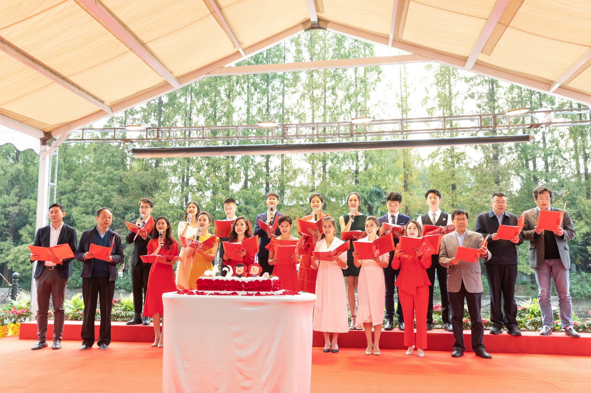 最后,全体演员和参与活动的嘉宾登台,齐声朗诵《师大礼赞》。“丽娃奔涌,值此六十七周年盛世华诞,愿华东师大,承前启后,继往开来;耀光华如日月永葆,施恩泽似丽娃绵长;耀光华如日月永葆,施恩泽似丽娃绵长!”
