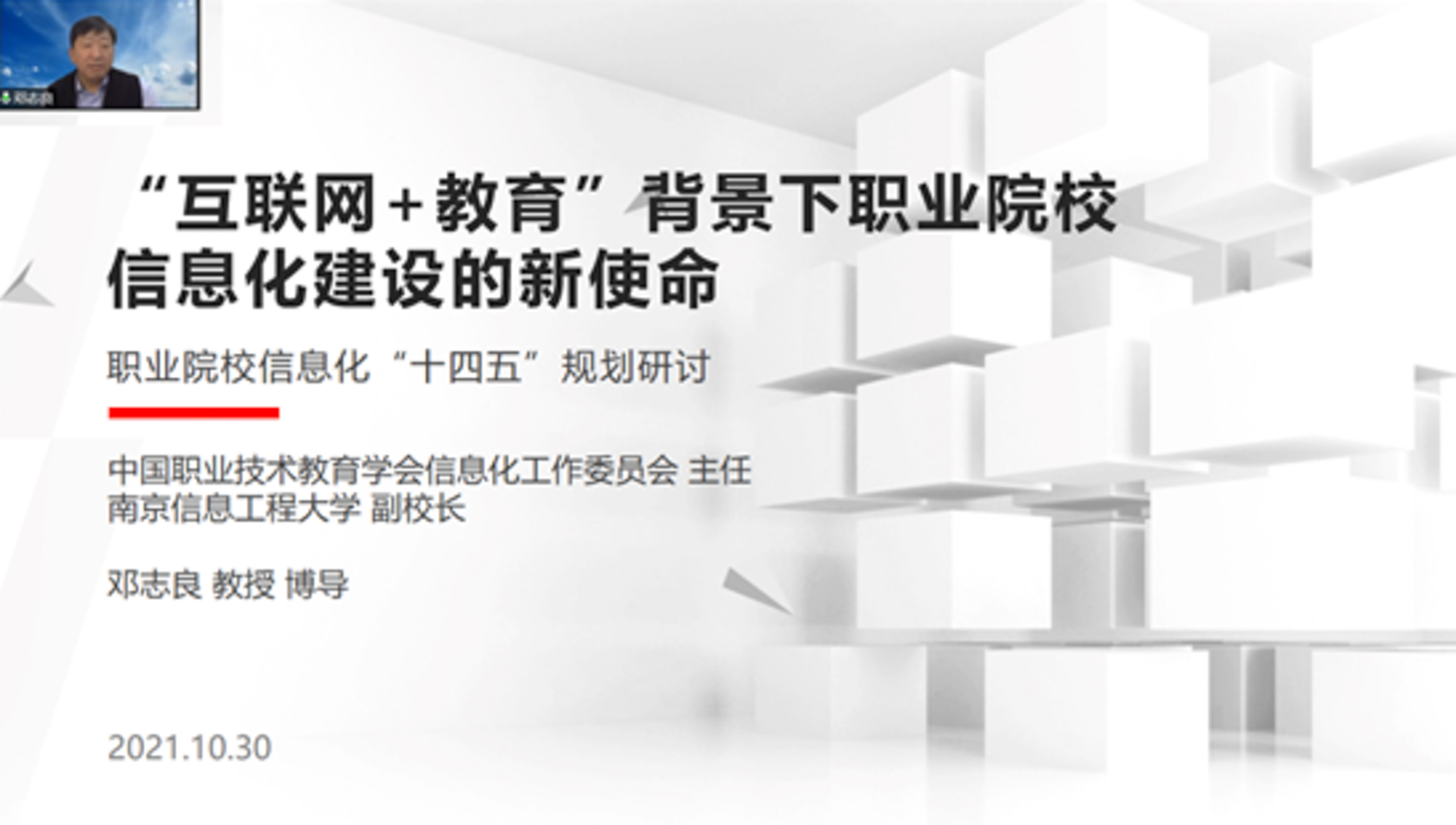 南京信息工程大学副校长邓志良总结并回顾了“互联网+教育”背景下职业院校信息化建设的主要成绩,指出了新一代信息技术发展的时代要求与任务使命,并从学校建设的角度提出要注重顶层设计、加强资源库建设、重视数据的收集和分析等。